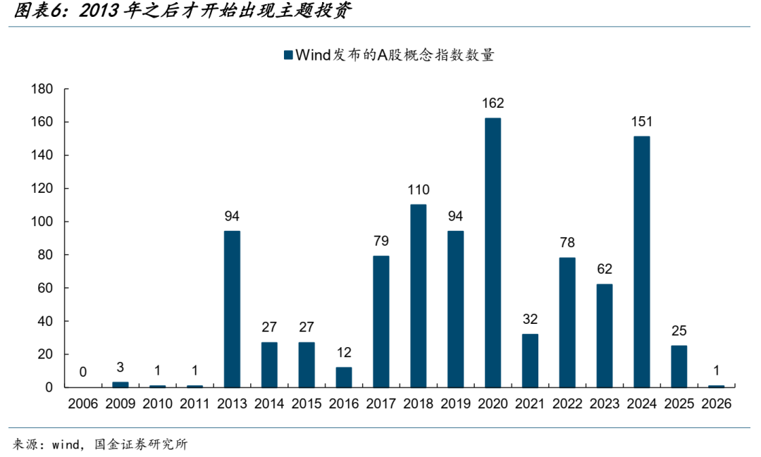 我们以Wind概念指数作为分析主题投资的样本,历史上发布数量较多的年份为2013年、2017-2020年以及2022-2024年。从新增的概念指数所涉及的领域来看,比如2013年的“智能+系列”和“移动互联网+”、2017年的消费白马、2019年的消费电子、2020年的核心资产、2023年的AI与中特估、2024年的央企系列概念指数、AI相关概念指数等,主题投资也绕不开当时市场的核心板块。