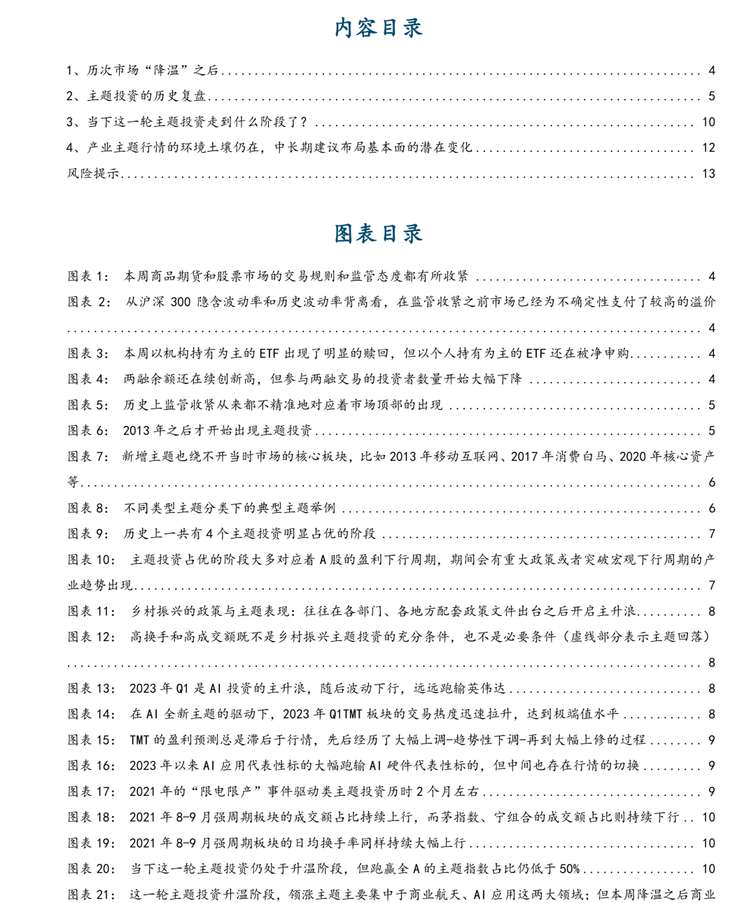 历史上监管“降温”并非主导行情结束的核心驱动,市场在后续反而大概率会继续创新高。对于主题投资而言,本轮主题投资实际上还未进入到指标意义上的“占优”,但主题投资的热度开始持续升温;即便本周监管“降温”,也只是让前期局部过热的主题出现了调整,而以AI应用、机器人为代表的相对滞涨或不那么过热的主题仍在持续轮动表现。从历史规律来看政策类和产业驱动类主题的行情级别远高于事件驱动类和全新主题,但核心还是在于业绩的兑现和验证;而具备长期宏大叙事的主题,投资者对于业绩的容忍度也会大幅提升,只不过需要关注交易过热的风险。因此结合历史规律和当前位置的判断,我们认为产业主题行情的市场环境、政策环境土壤仍在,下一个关键验证时点在于4月份一季报的业绩披露。结合短期的成交情绪和滞涨程度,我们对于当前热门主题的排序是:人形机器人>AI应用>脑机接口>商业航天等。而主题之外,我们依旧看好中长期基本面潜在变化带来的相关领域的投资机遇,继续推荐:一是继续看好AI投资与全球制造业复苏共振的工业资源品——铜、铝、锡、锂、原油及油运;二是具备全球比较优势且周期底部确认的中国设备出口链——电网设备、储能、锂电、光伏、工程机械、商用车,以及国内制造业底部反转品种——印染、煤化工、农药、聚氨酯、钛白粉、晶圆制造等;三是抓住入境修复与居民增收叠加的消费回升通道——航空、免税、酒店、食品饮料;四是受益于资本市场扩容与长期资产端回报率见底的非银(保险、券商)。