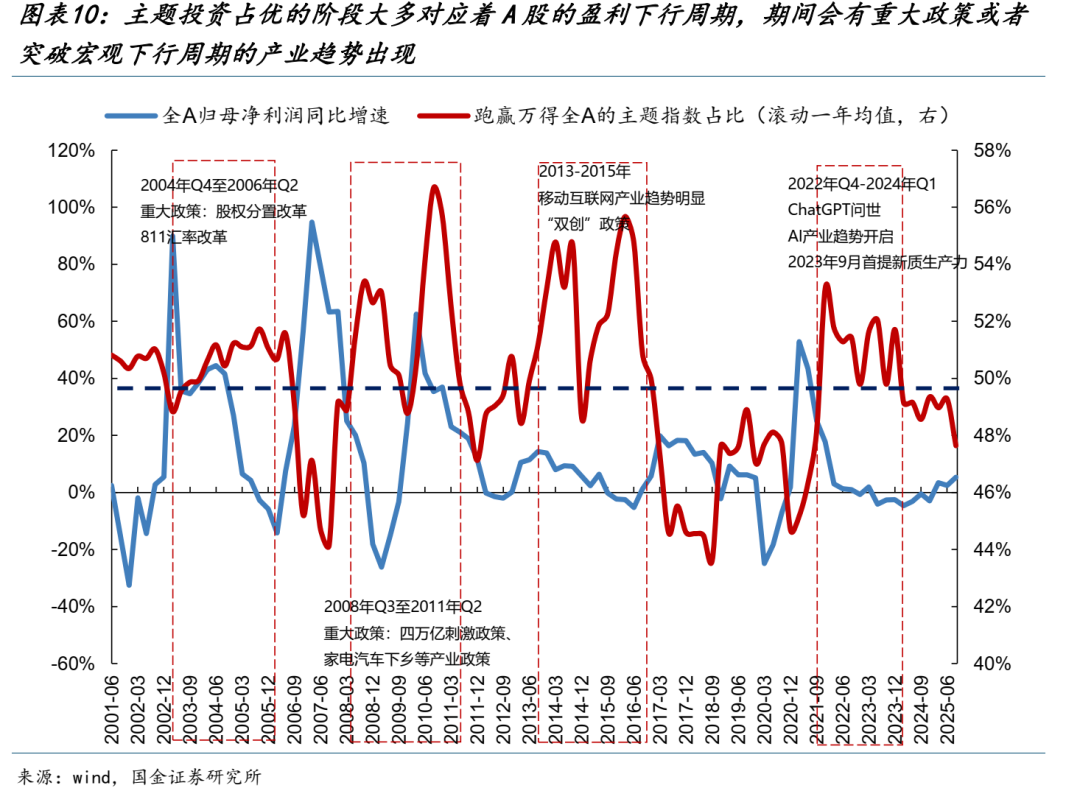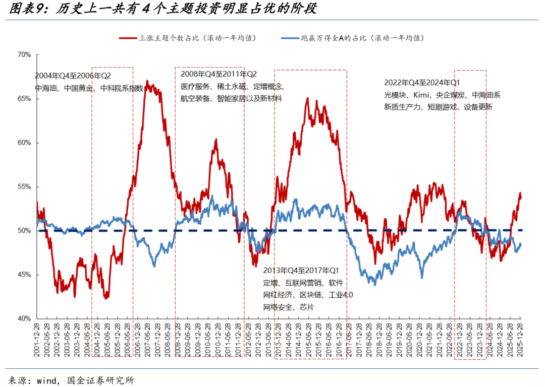 我们将根据以下指标来判定何时主题投资处于占优阶段:区间内(最小周期设定为周度,滚动一年计算)概念指数跑赢万得全A的占比≥50%。通过历史复盘来看,2000年以来一共有4个主题投资明显占优阶段: