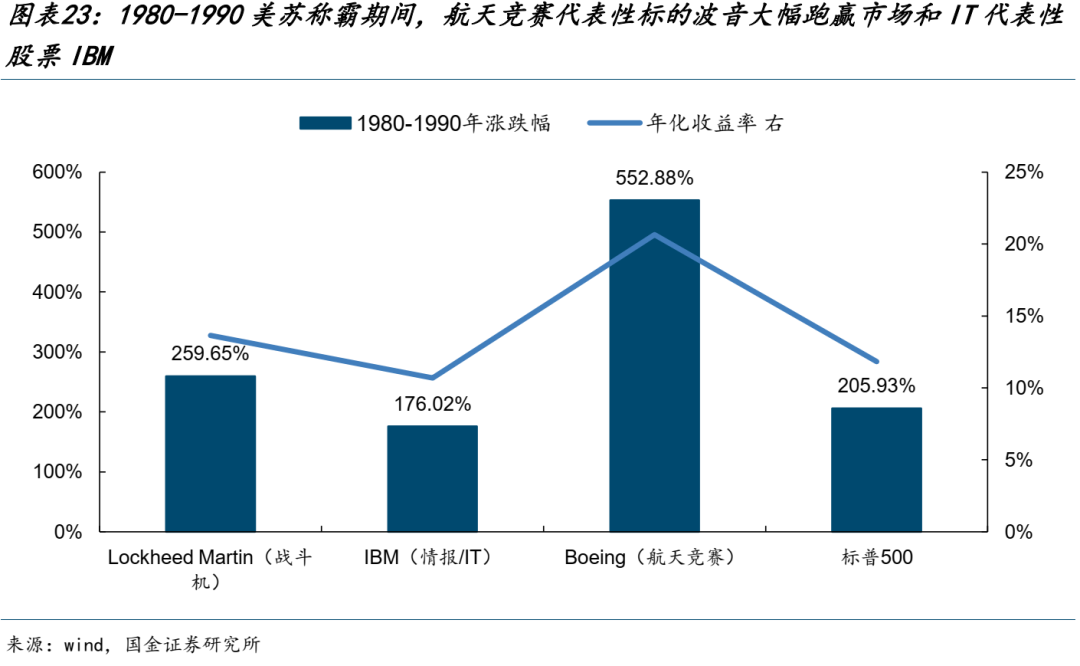 尽管如此,如果类比1970-1980s美苏争霸高峰时期由于军备竞赛带来的美股相关军工股票的主题投资机遇,以波音为代表的航天竞赛代表性标的大幅跑赢标普500和IBM