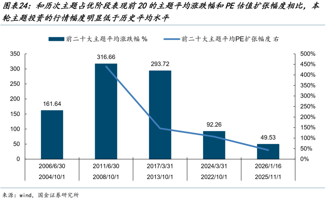 况且,与历史上典型的主题占优阶段的代表性主题涨跌幅和估值扩张幅度对比来看,当前主题投资的结构性过热也不算很极端。