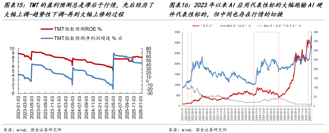 随后伴随着海外AI产业趋势的持续验证,资本开支预期大幅上调,AI主题投资开始逐步转为以AI算力产业链为代表的高景气、产业赛道投资,业绩预期大幅上修。到了当下,经历了2025年的产业浪潮之后,市场关注的焦点又开始像2023年Q1时一样转向下游应用侧,核心原因在于市场对未来AI资本开支持续性的担忧以及上市公司业绩预期开始出现明显分化,重新寄希望于AI应用的突破和爆发。