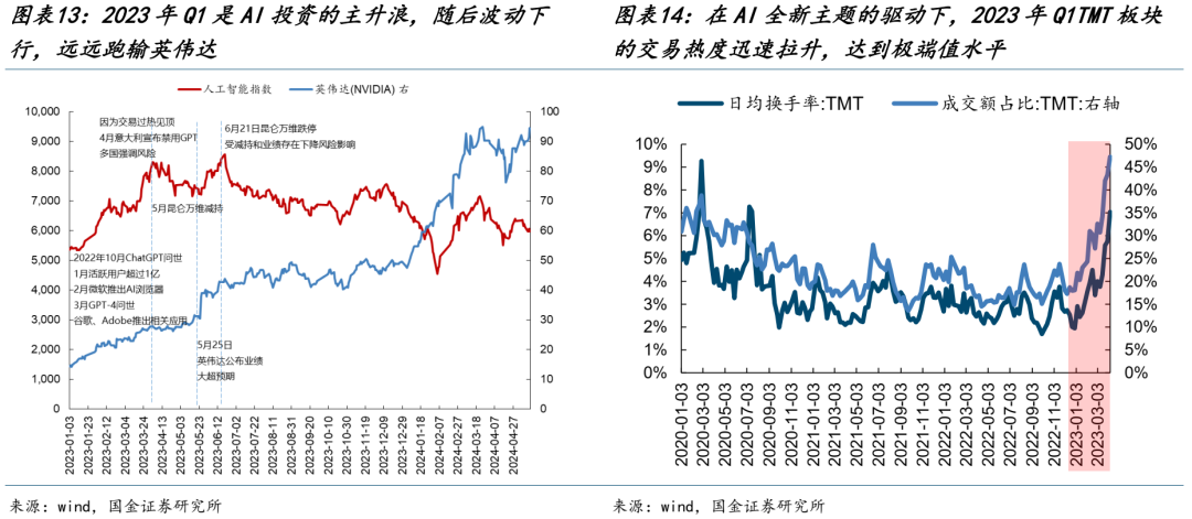 (2)对于产业驱动型&全新主题而言,我们以2023年的AI为例:彼时的AI还算是全新主题,2022年10月ChatGPT的问世,在产业信息爆发的环境下,2023年Q1的AI主题投资迎来了主升浪。当时市场对于TMT的盈利预测甚至还在下降,一直到市场交易过热之后才有所回升。但随着交易热度达到历史极端值以及产业负面信息开始逐步取代此前的产业利好信息,AI主题投资持续回落。