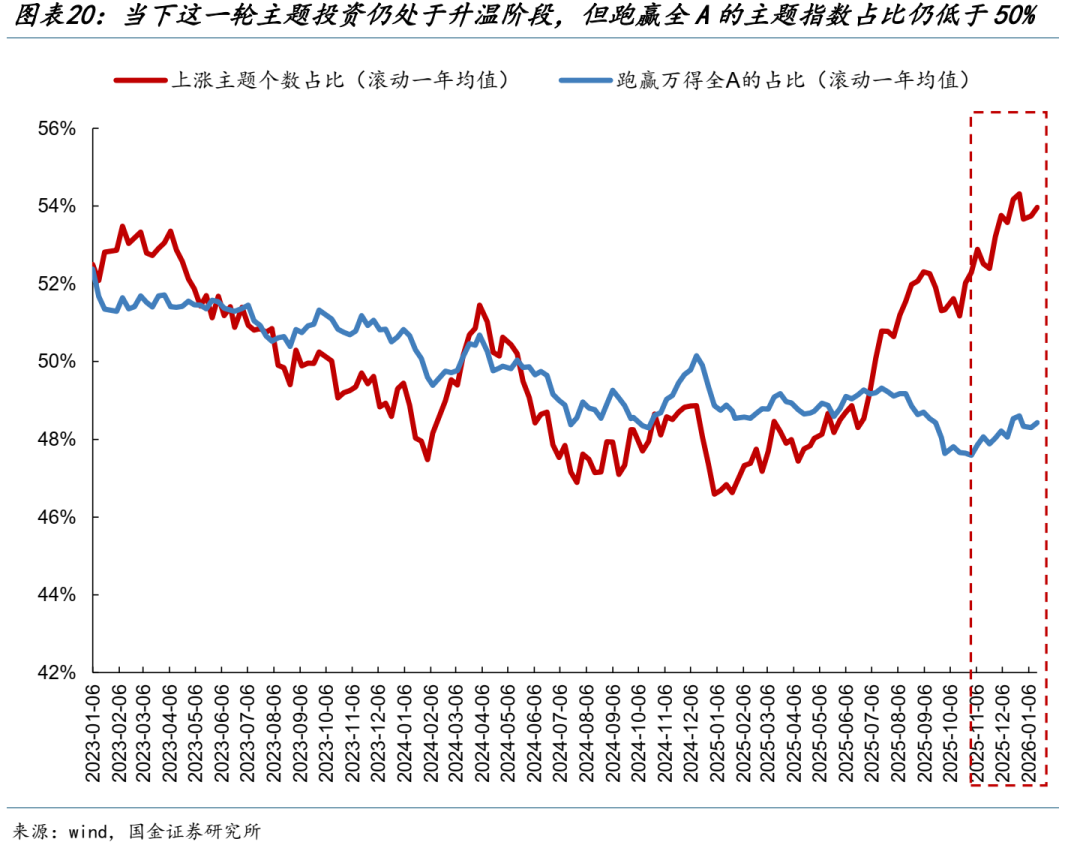 当下这一轮主题投资,整体而言其实还未达到明显占优的特征,但已经处于热度明显上升的阶段:本周跑赢全A的主题指数占比仅为48.43%,还未超过50%的阈值,但已经自2025年11月以来持续抬升;而上涨主题个数的占比实际上已经超过了2023年Q1,达到54%。
