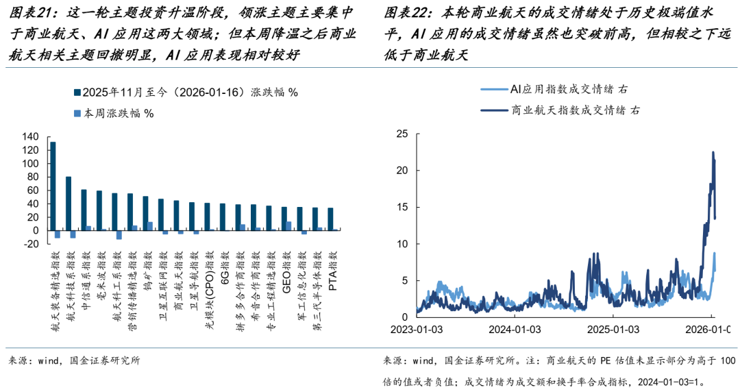 从本轮的代表性主题来看,2025年11月至今(2026-01-16)领涨全市场的主题主要集中于商业航天和AI应用相关概念主题。商业航天主题启动背后主要由国家战略性政策出台以及在中美博弈背景下科技强国的战略地位所支撑,2025年11月25日国家航天局印发《国家航天局推进商业航天高质量安全发展行动计划(2025—2027年)》,成为行情的主要导火索;与此同时产业层面也开始持续有催化印证,比如2025年12月29日,我国向国际电信联盟(ITU)一次性申报超20万颗卫星频轨资源,直接点燃了资本市场对于商业航天的预期。所以商业航天更像是政策+产业驱动类的综合性主题。而AI应用主题投资的再度回归则是基于产业本身的催化:一方面智谱、MiniMax两家通用大模型企业相继在港交所上市,引发资本市场的关注;另一方面,DeepSeek将计划于2月中旬推出最新旗舰模型V4;同时随着谷歌、亚马逊等巨头试点AI购物助手,国内电商平台也通过AI生成商品推荐文案,AI+传媒营销成为新热点。但在本周降温之后这两大核心主题的表现出现了明显分化:商业航天相关概念主题出现了明显的回撤,而AI应用表现相对较好,核心差异在于AI应用前期整体涨幅以及成交情绪都明显低于商业航天。