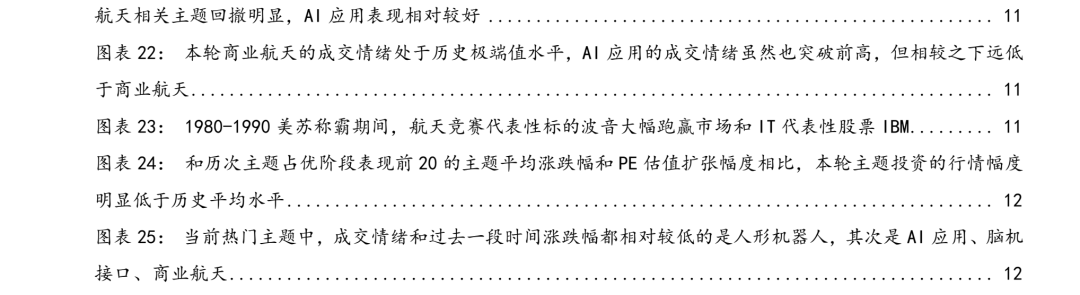 当下这一轮主题投资整体而言其实还未达到明显占优的特征,但已经处于热度明显上升的阶段:本周跑赢全A的主题指数占比仅为48.43%,还未超过50%的阈值,但已经自2025年11月以来持续抬升;而上涨主题个数的占比实际上已经超过了2023年Q1,达到54%。从本轮代表性主题来看,领涨全市场的主题主要集中于商业航天和AI应用相关概念主题。但在本周降温之后这两大核心主题的成交情绪都有所回落,尤其是商业航天出现了大幅回撤。尽管如此,如果类比1980-1990s美苏争霸时期由于军备竞赛带来的美股相关军工股票的主题投资机遇,投资者对于具备长期宏大叙事的主题投资的业绩容忍度可能会更高。况且与历史上典型的主题占优阶段的代表性主题涨跌幅和估值扩张幅度对比来看,当前主题投资行情不算极端。