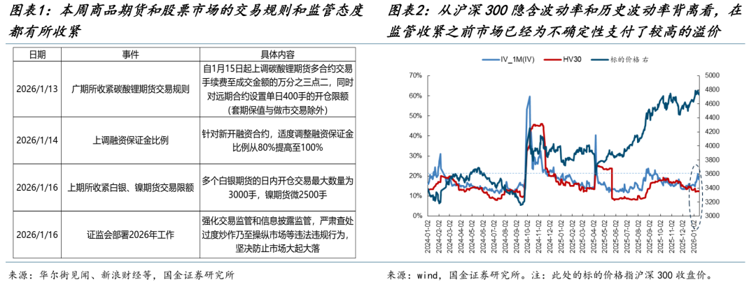 本周(2026-01-12至2026-01-16,全文同)商品和股票市场同时出现了“降温”,让对应市场的交易情绪也有所回落,但我们对此次监管“降温”的观点是:更有利于稳定投资者的预期。因为从沪深300本轮年初以来隐含波动率和历史波动率出现的背离来看,意味着虽然市场在本周监管“降温”之前一直处于上涨的趋势中,但投资者担心未来的波动反而会放大。所以其实如果没有监管的出手,可能市场本身也会在未来的某个时点面临回撤。从资金层面来看,以机构持有为主的ETF出现了明显的赎回,参与两融交易的投资者数量开始见顶回落。历史上看,在市场快速上行的过程中出现监管“降温”的案例屡见不鲜,但与市场顶部往往不是一一对应。比如2015年的两次监管收紧之后,市场的顶部也就随之出现,但存在一个月的时滞;而2019年和2020年的监管收紧之后,市场虽然短期也会有所回撤,但后续股指也都突破了前高。此次监管“降温”并不改变我们中长期对于权益市场中枢上移的看法。当下可能更值得讨论的是在监管“降温”之后,此前市场较为火热的主题投资未来会如何演绎。