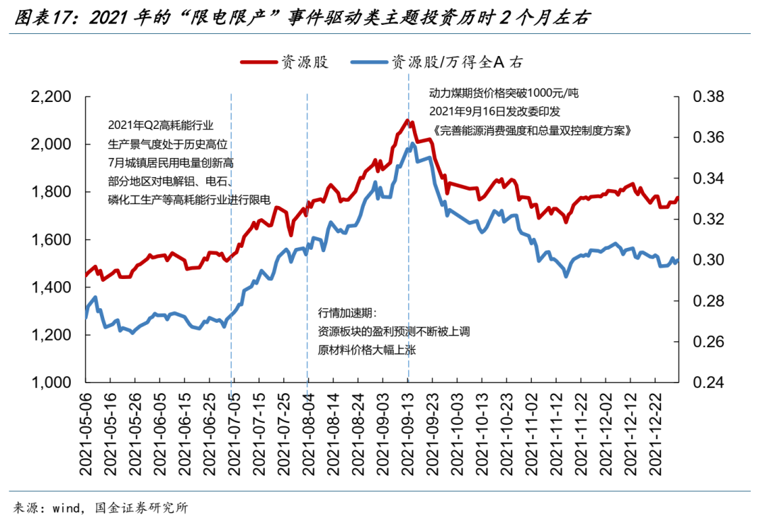对于事件驱动类主题投资,我们以2021年Q3的“双碳”叠加“限电限产”为例:事件驱动类主题投资往往周期较短,市场反应十分迅速和剧烈,但与此同时也具备较强的政策/基本面可跟踪性,同时市场的交易热度基本上也决定了行情的终结。具体来看:2021年7月,限电限产主题行情的开启背后是全国多地出现用电紧张,用电量、用电负荷历史记录不断被刷新。2021年8月-9月中旬,行情加速,强周期板块“一枝独秀”。强周期行情出现了明显的过热,与此同时以动力煤为代表的商品价格也在不断上涨。2021年9月中旬之后,限电限产主题行情的结束:随着限电及能耗双控的严格推进,标志性事件是2021年9月16日发改委印发《完善能源消费强度和总量双控制度方案》,市场开始表达对于周期板块的下游需求的担心,认为价格的上涨是不可持续的。但其实能耗双控等政策从8月就已经开始出现了,8月20日当周强周期行情也暂歇了一周,但市场一直到9月中旬才真正意识到这一点。