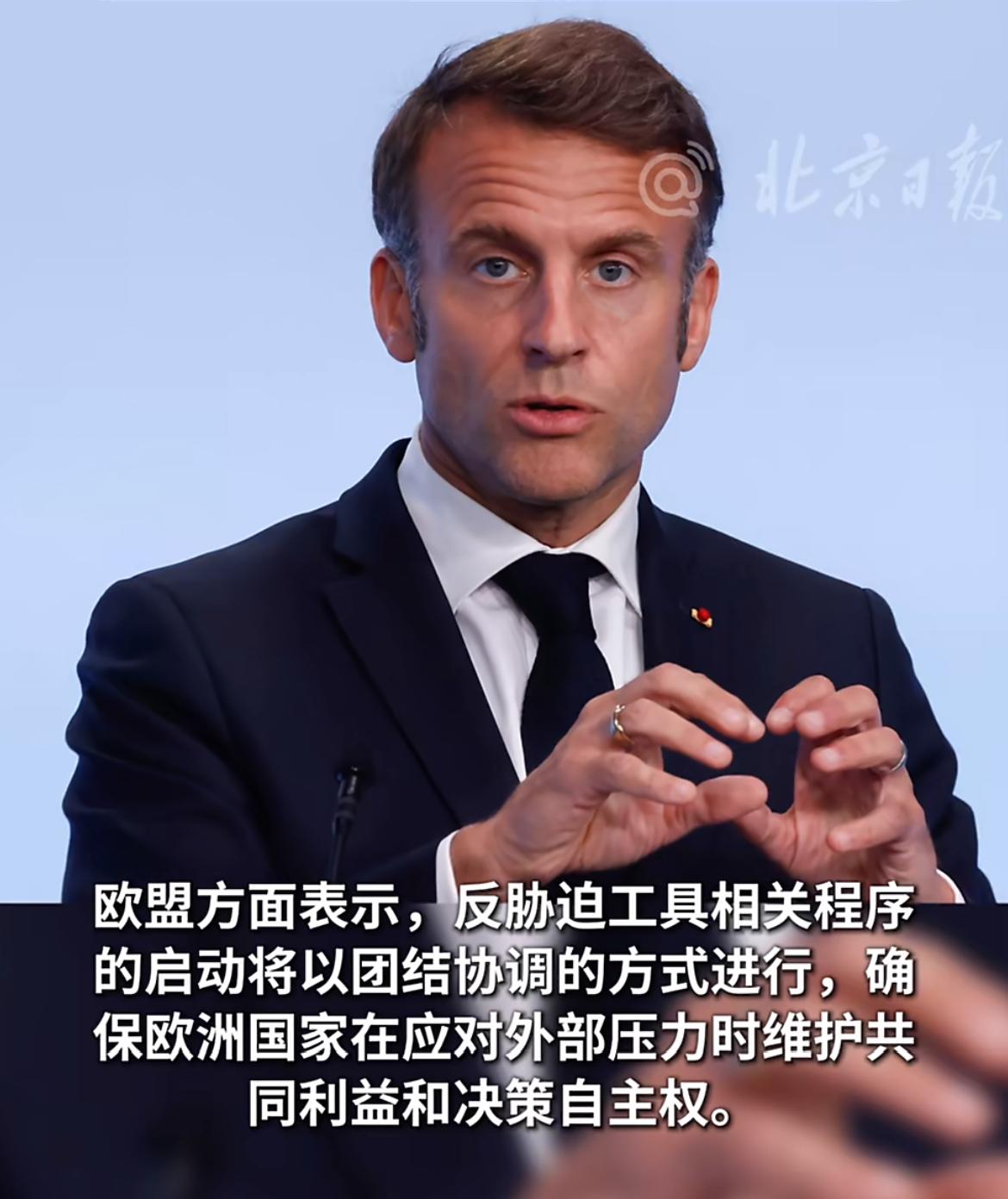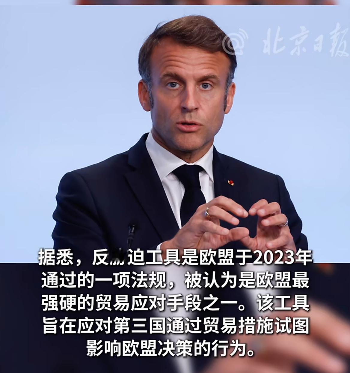 马克龙终于对美硬气了一把! 当地时间1月18日,法国总统马克龙宣称,必要时将代表法国请求启动欧盟反胁迫工具。这是法国针对美国政府关税威胁给出的首个官方回应。 据悉,反胁迫工具是欧盟于2023年通过的一项法规,被视作欧盟最强硬的贸易应对手段之一。该工具旨在应对第三国借助贸易措施妄图影响欧盟决策的行径。 此次美国公然欺辱欧盟,马克龙实在忍无可忍。此前,美国一系列贸易政策严重损害了欧盟的经济利益。此次特朗普再度加税,显然是想逼迫欧盟在格林兰岛上屈服让步。 一个细节值得注意,加税从2月1日起开始执行,从现在到2月1日还有大约10天的协调期,这或许是美国有意留给欧盟的协商机会。接下来就看欧美如何博弈了! 反正美国制裁的是欧洲8大强国,倘若这8强国倒下,那欧洲的威望也就荡然无存了! 可见,美欧这次围绕格林兰岛的争夺就是一个生死局!胜者为王 败者为寇!所以,博弈必定会很激烈。不清楚马克龙是坚持到底?还是举手投降?