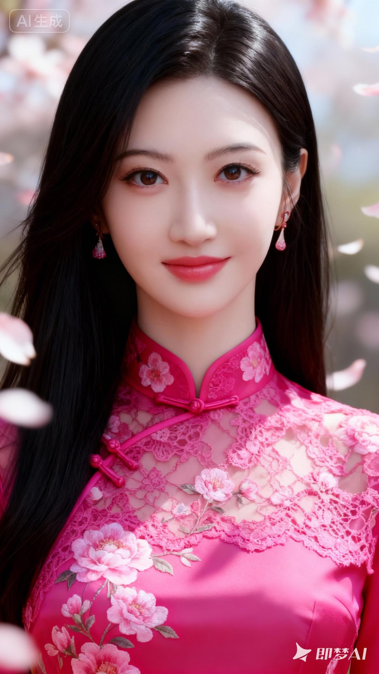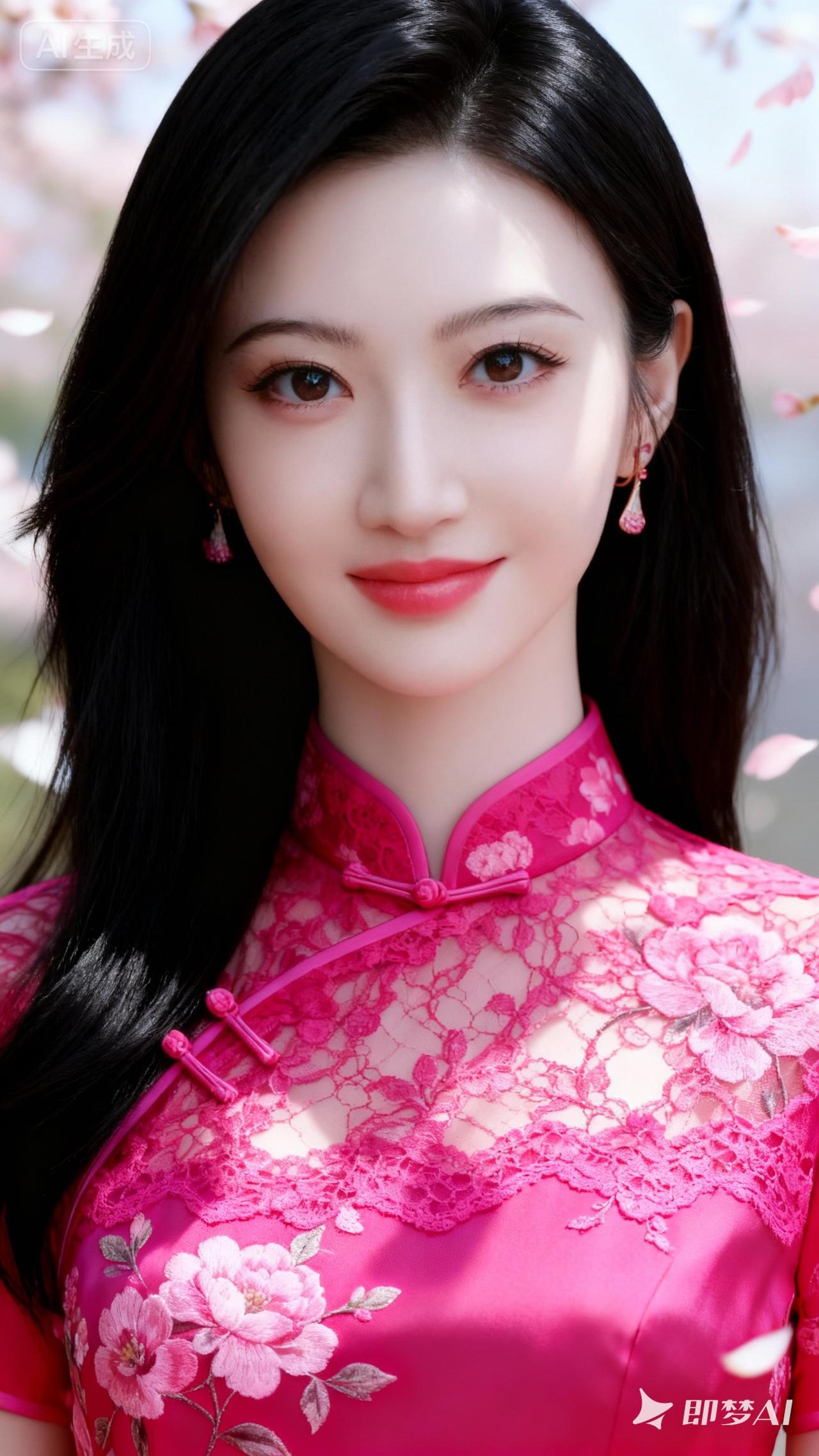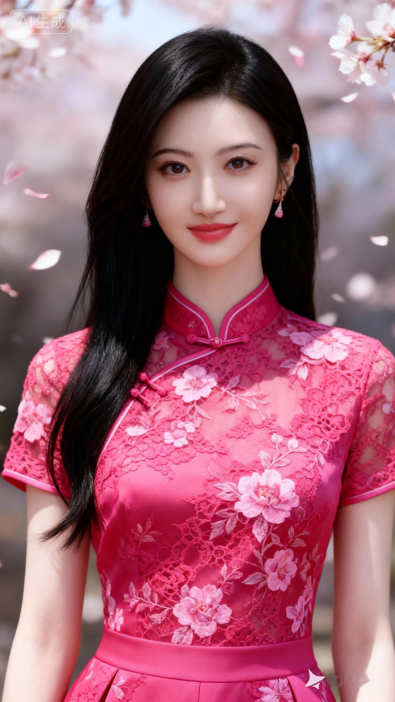 樱花树下,少女如花,粉裙飘逸,春意盎然。