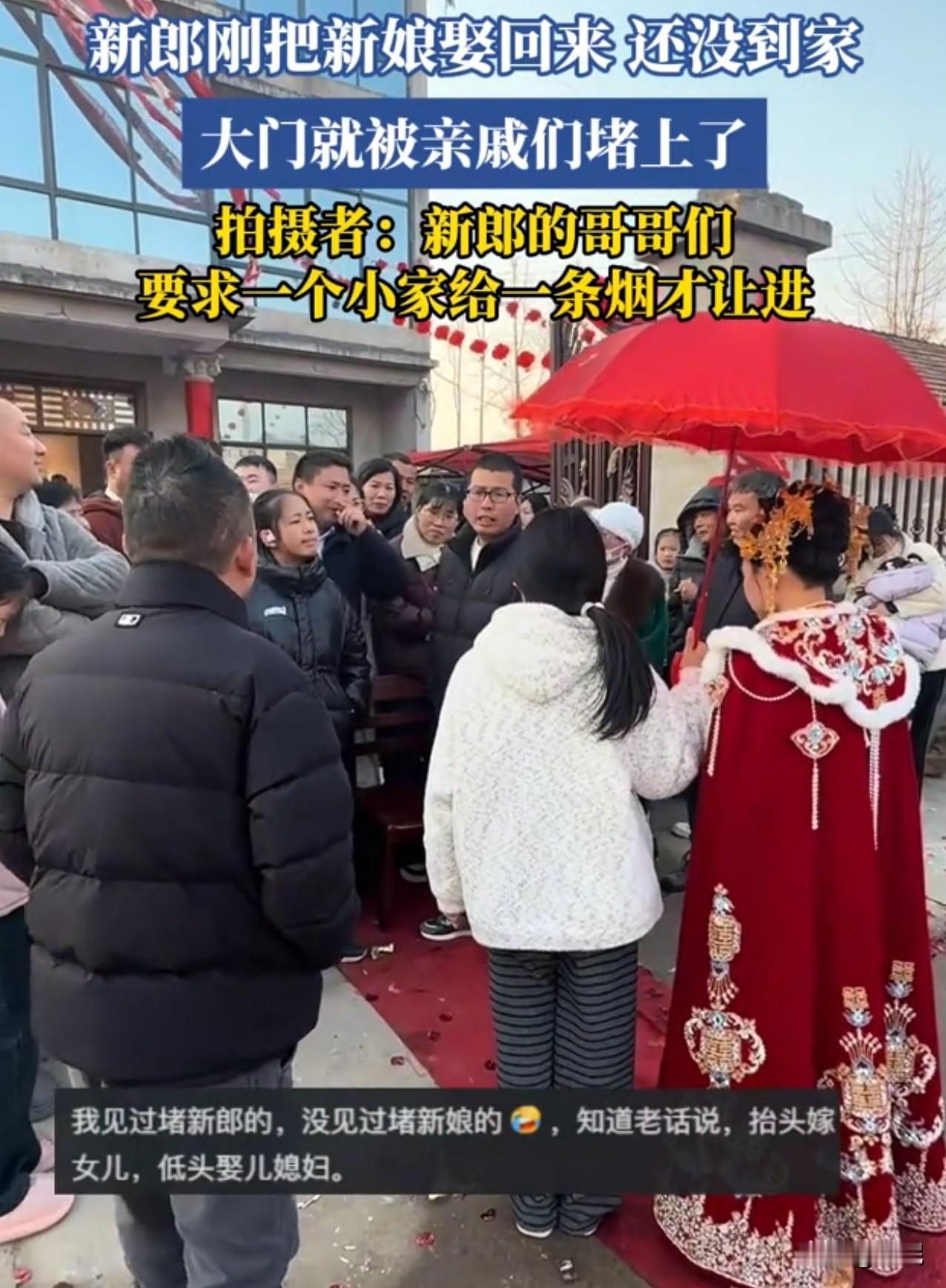 见过堵新郎,头一回见堵新娘,真稀奇! 江苏,一新郎刚把新娘娶回来,还没到家,大门就被亲戚们堵上了。新郎的哥哥们要求,每个小家给一条烟才让进。 哪个地方不是新娘还没到,就在门口等着,看人差不多到门口就放鞭炮,赶紧上去迎接新娘进门。 这地方倒好,直接把新娘堵门口!乌泱泱的一堆人,这是不想新郎结婚,还是看不起新娘?这不怕新娘直接转头就走了吗? 大喜的日子给下马威,关键新娘还能忍,站那老半天没动!遇到个硬气的,直接转身就走,不嫁了! 有人说女方家可以堵门,为啥到男方家就不可以堵门,不是男女平等吗? 女方家这么做是因为女方要离开,自己从小长大的地方去到一个陌生的环境生活。男方家堵门,算什么?如果是入赘就另当别论了! 婚闹应该是在合理,且让双方都舒适的状态下闹一闹,图个喜庆热闹!像这种男方亲戚堵门要烟的行为,可就有点变味了。这哪是婚闹,分明是在给新人添堵。 希望以后类似这种给新人添堵的“奇葩”婚闹能越来越少,让每一场婚礼都能真正成为新人幸福的起点,充满温馨与欢乐。