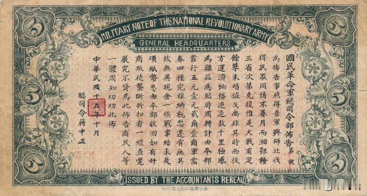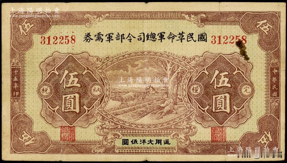 这一张纸币是民国十五年(1926年)国民革命军总司令部军需券伍圆。这是北伐战争时期的军用货币,由国民革命军总司令部发行。 用途: 作为北伐时期的军票使用。 特征: 纸币正面中央为耕作和伐木场景,背面印有国民革命军总司令蒋中正签名的布告。 印刷: 由长沙同益印刷公司代印。