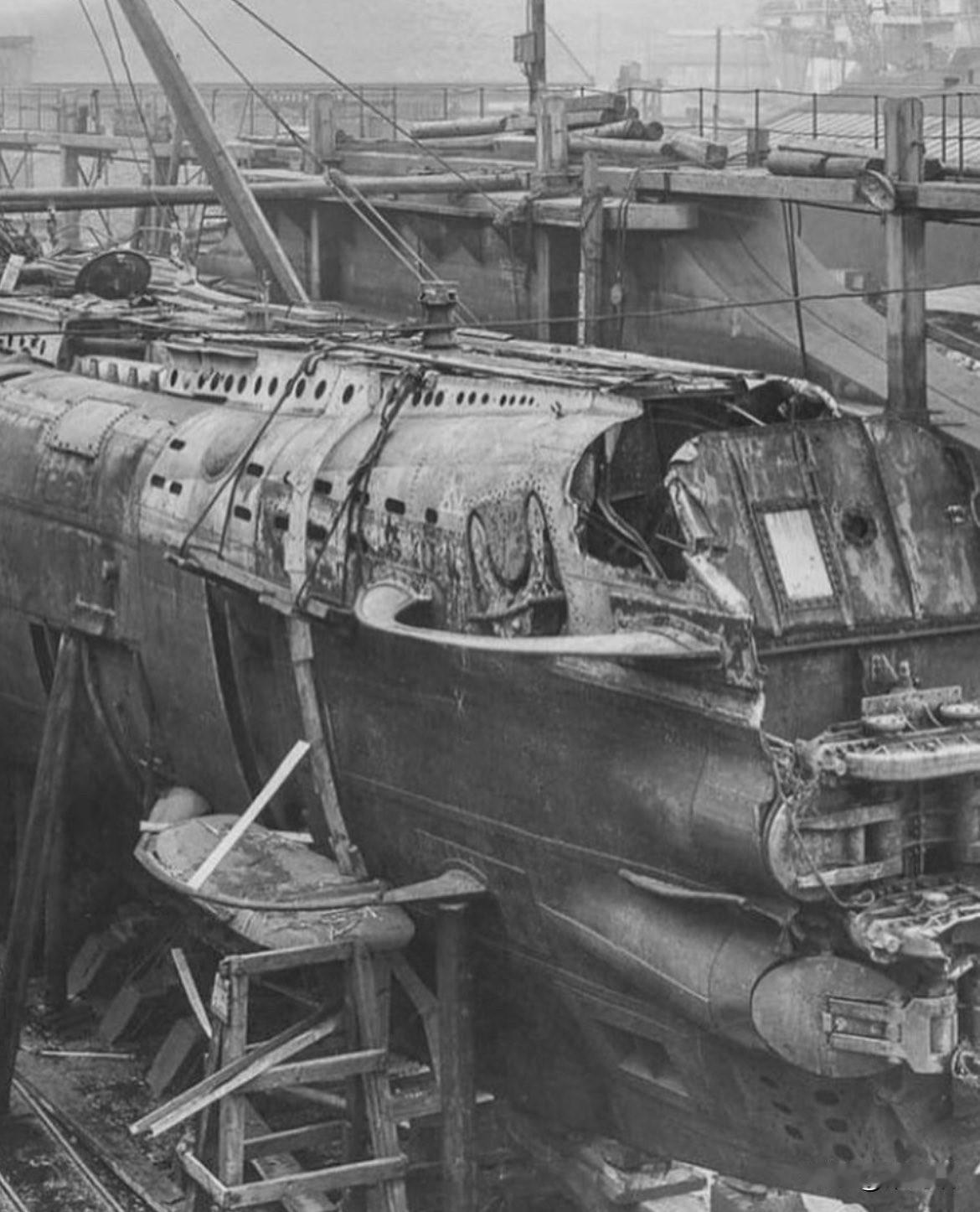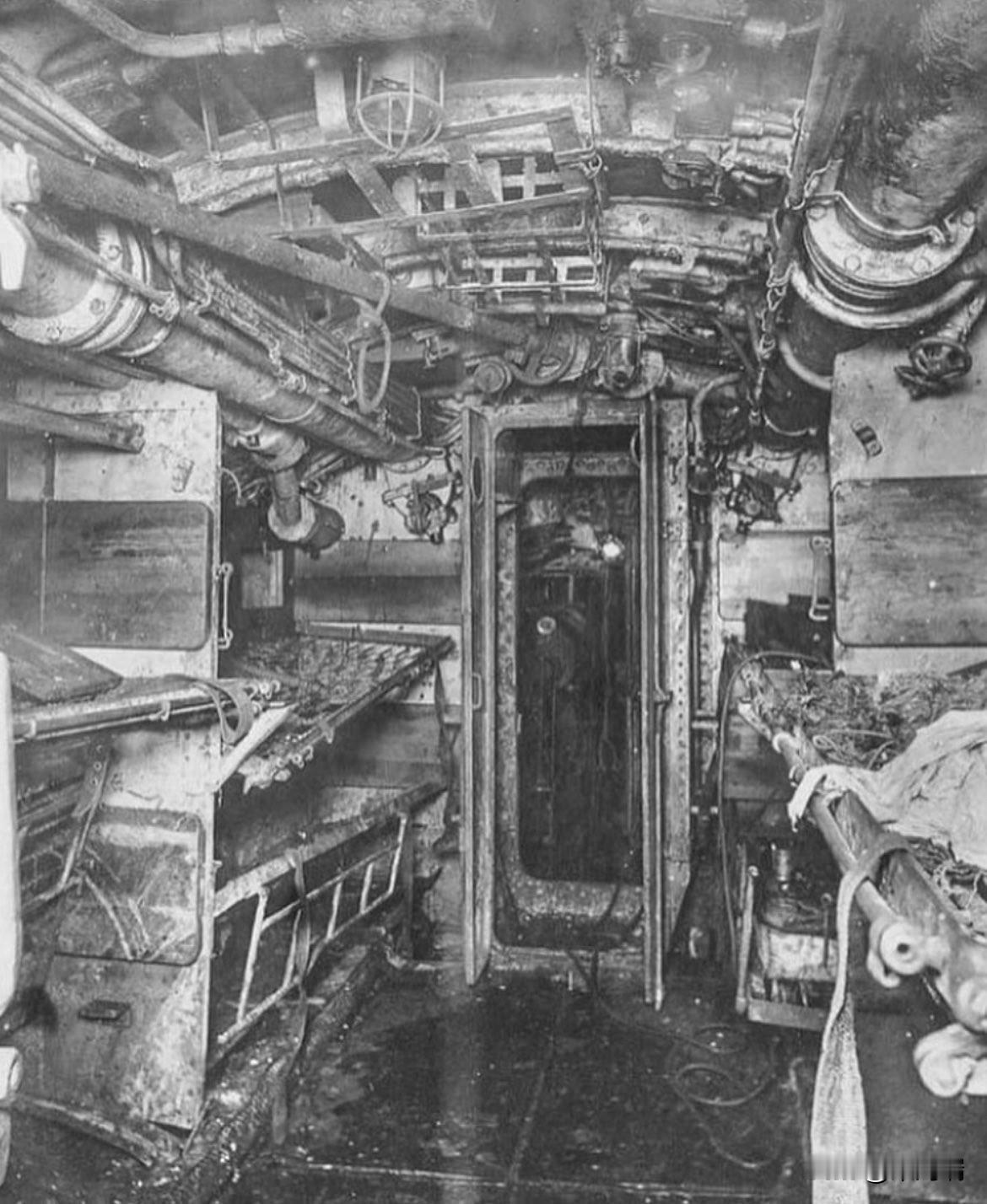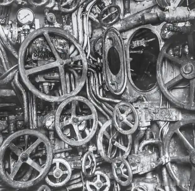 这张照片展示的是第一次世界大战德国UB-110潜艇的控制室内部。 这张历史照片摄于1918年潜艇被打捞出水之后,展示了当时潜艇内部狭窄而复杂的机械结构。 潜艇型号: SM UB-110。 时期: 第一次世界大战(1918年)。 背景: UB-110在1918年7月的一次攻击行动中被击沉,同年9月被英国人打捞上来,以便进行研究和最终拆解。 控制室细节: 照片中的景象包括通往潜望镜井的人孔、用于压力装置的手轮、用于注水和吹气的阀轮以及气压表等。 操作: 尽管看起来阀门和轮子众多,但许多都有颜色编码和编号,且水手们经过专业训练,能够熟练操作。 这张照片因其独特的视角,展示了一战时期潜艇内部幽闭恐怖但功能齐全的设计,而成为一张罕见的历史影像。