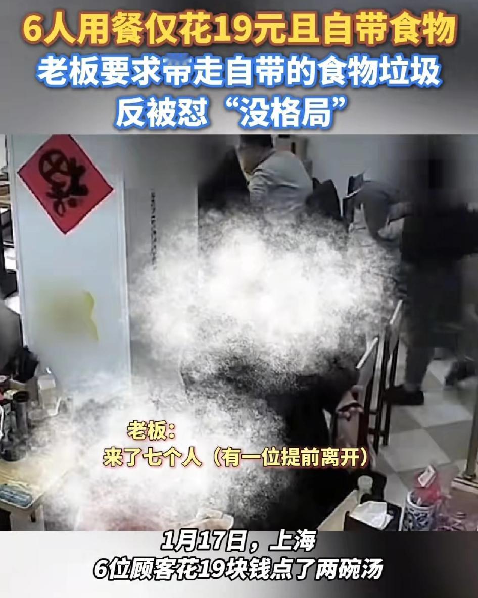 上海一家餐馆,6人进入餐厅,自带着食物,在餐厅只点了两碗汤,而且用餐厅里面的碟子,调味料,还有餐具,足足坐了一个半小时,临走时,老板要求他们把自带的食物垃圾带走,却被怼:老板没有格局。老板很无奈自己做的就是小本生意,却遇上这样的客人。