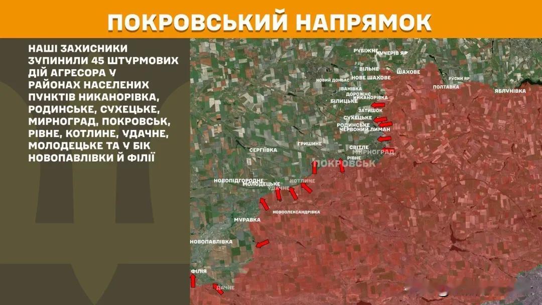 乌军打击了克里米亚俄占区的防空设施,包括 叶夫帕托里亚附近的Nebo-U雷达和胡托罗 克附近的Pantsir-S1系统。 乌军还袭击了顿涅茨克附近的一处无人机存储 点。损失情况正在评估中。 波克罗夫斯克 乌克兰守军在尼卡诺里夫卡、罗季涅、苏赫奇 斯克、米尔诺赫拉德、波克罗夫斯克、里夫 涅、科特利内、乌达赫涅、莫洛杰茨克等地 点,以及朝新帕夫利夫卡和菲利亚方向,击退 敌人45次进攻。
