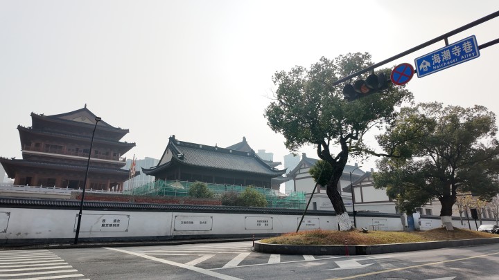 海潮寺,紧挨着甬江路和秋涛路。北面是去年刚回迁的秋望悦居小区;南面是九年一贯制的钱学森学校;西面是与寺庙同步在建的文化休闲街区,整体设计风格与海潮寺和谐共生。