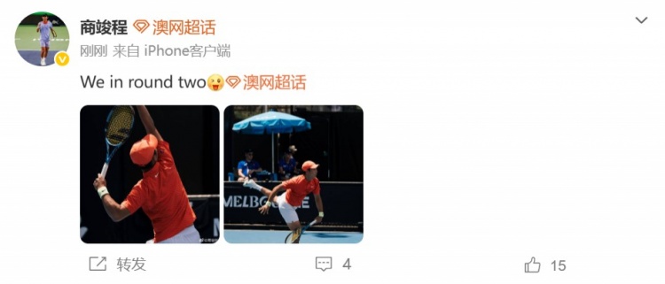 直播吧1月19日讯网球运动员商竣程更新社媒,庆祝自己晋级澳网男单第二轮。