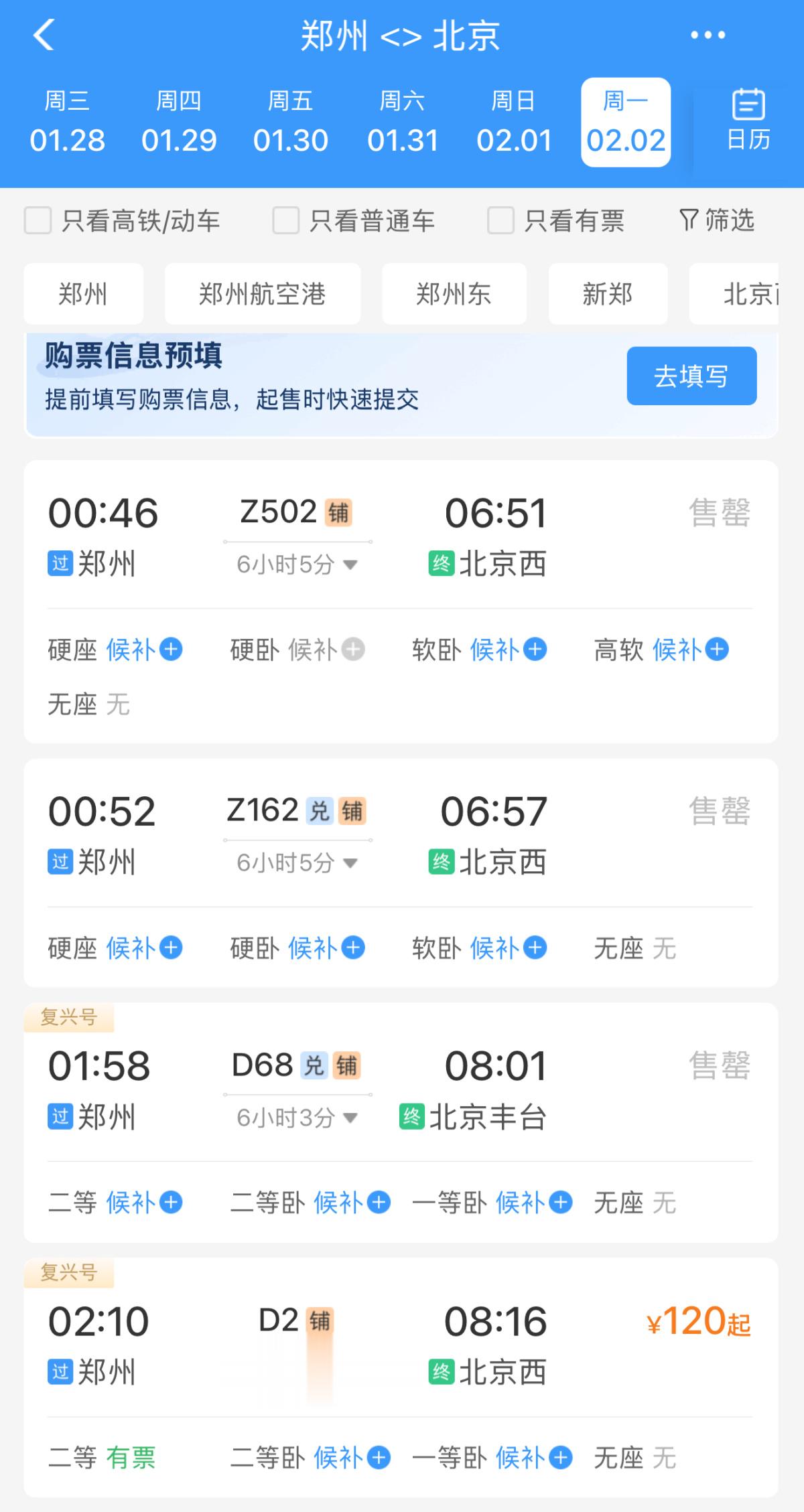 上午11时,距离北京西站火车票起售时间已过了3个小时。记者浏览发现,从北京开往郑州的多趟列车余票充足,仅少量车次出现售罄字样。下午15时20分,郑州站及郑州东站开售春运首日车票,记者发现,多趟普速列车开票3分钟就已售罄,而高铁余票充足,且整个抢票过程非常丝滑,全程无卡顿。