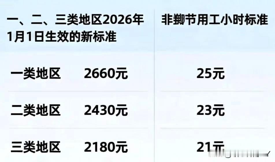 江苏打工人快看!一月起最低工资标准上调! 2026年1月1日起,江苏省对最低工资标准进行了调整。 一类地区(南京、无锡、苏州等)月最低工资标准为2660元,小时最低工资标准为25元;二类地区(如:南通海安、扬州宝应等)月最低工资标准2430元,小时最低工资标准23元;三类地区(如:徐州丰县、宿迁沭阳等)月最低工资标准为2180元、小时最低工资标准为21元。 注意:加班费、特殊工作环境津贴等,不算在最低工资里,用人单位需依法足额支付。若工资低于标准,可拨打12333维权。 你所在的城市属于哪类地区,工资是否已经按新标准发放?