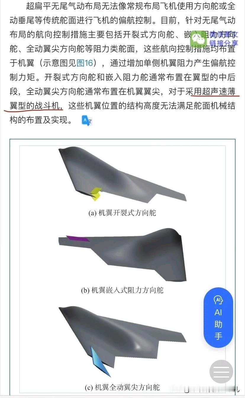 西飞和南航结合起来的这个论证 不就是能超音速的水分子吗 超扁平无尾的超音速飞翼设计在实际研发里藏着很大的难题,传统的方向舵、全动垂尾这些控制部件根本用不了,之前常用的开裂式、嵌入式还有全动翼尖方向舵,因为超声速薄机翼的结构高度不够,也没法装上去实现偏航控制。 而南航的某个论证成功的论文就是研究的这技术点,虽然更倾向于小型超音速飞翼的研究,至于飞行姿态控制,主动吹气技术应该是关键突破口,不用依赖传统舵面,刚好适配超扁平设计,也是水分子相关领域的方向。