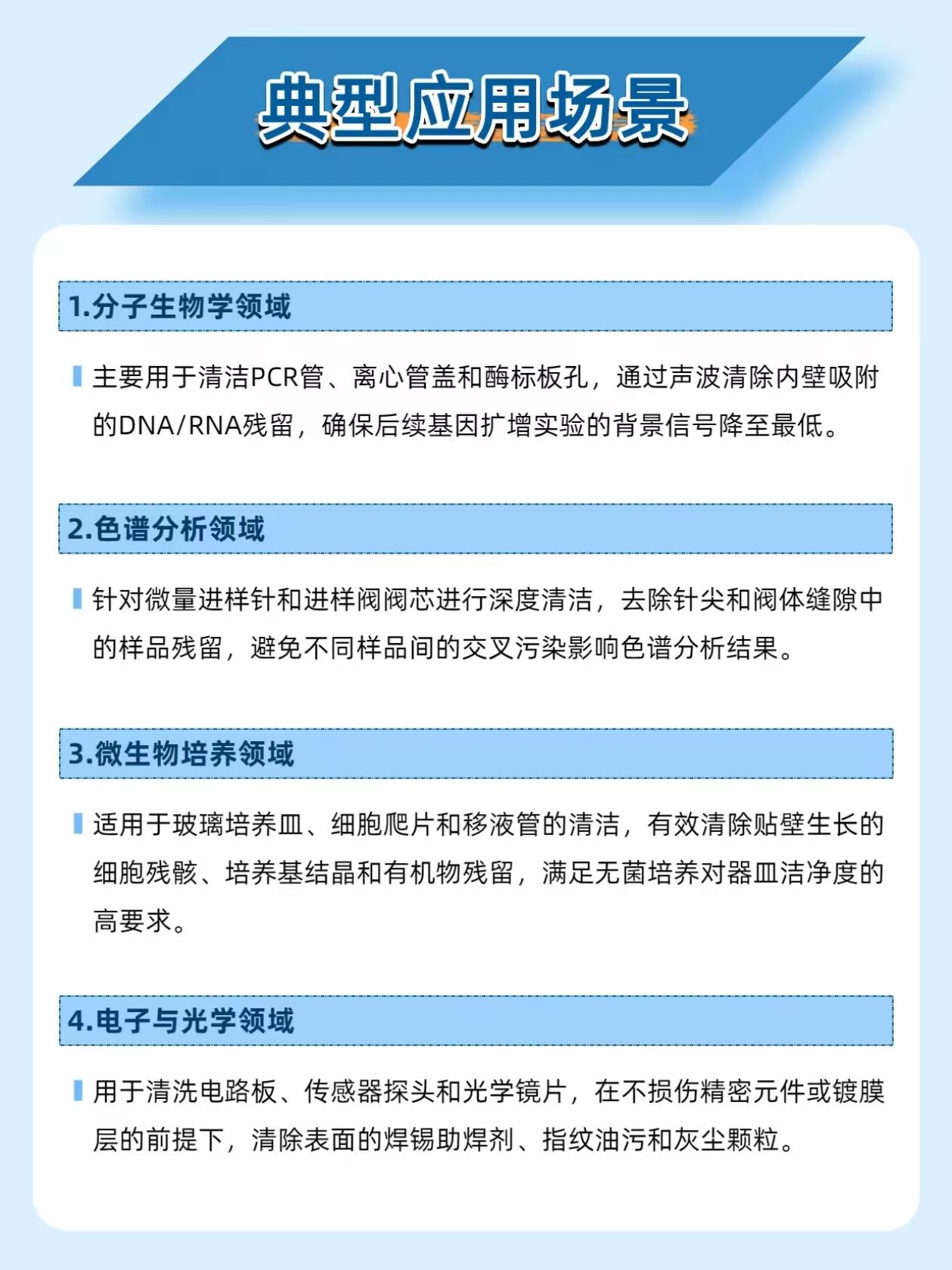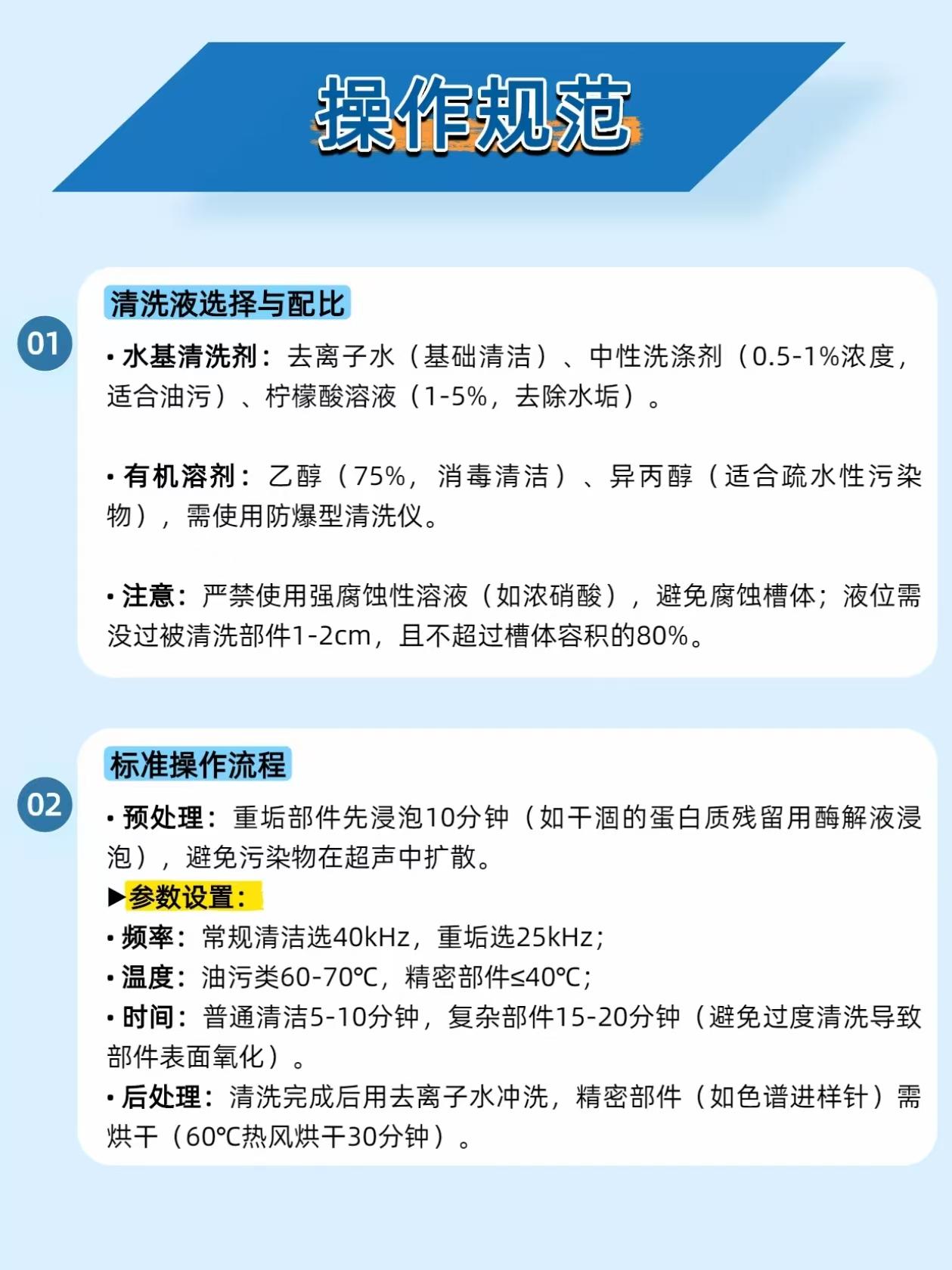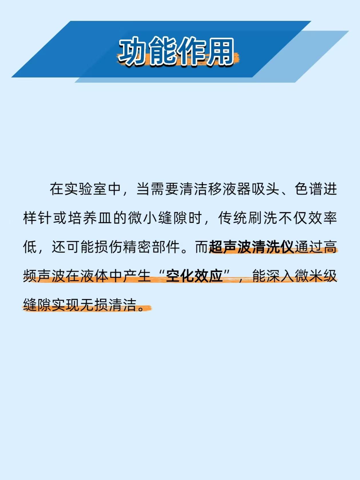 《实验器材洗不干净?这台仪器靠 “炸气泡” 搞定微米级脏东西!》 实验室里的移液枪头、色谱进样针,缝隙里的蛋白残留、油污刷都刷不到,还怕弄坏精密部件?其实超声波清洗仪才是 “清洁神队友”,靠高频声波炸出无数小气泡,崩溃时的高压冲击波直接震掉微米级脏东西,比手洗干净 10 倍还不损器材! ✅ 用对了才是神器,这几步别瞎搞! 频率选对才高效:洗油污、重垢用 25kHz 低频(气泡大冲击力强);洗光学镜片、电子元件用 40kHz 高频(气泡小不损表面) 水温加对去污猛:油污类 60-70℃(溶解度翻 3 倍),精密部件别超 40℃(防氧化) 避坑保命操作: ❌ 绝对不能空转!没液体开机直接烧换能器 ❌ 别装太满!单次清洗量超槽体 1/3,清洁力直接降 30% ✅ 洗完精密件立刻热风烘干(60℃烘 30 分钟),避免留水印 👉 这些场景直接封神! ✅ PCR 管 / 离心管:震掉内壁 DNA 残留,实验背景信号直接拉低 ✅ 色谱进样针:清掉针尖缝隙样品残留,避免交叉污染 ✅ 培养皿 / 移液管:搞定贴壁细胞残骸、培养基结晶,无菌培养稳了 别再手刷器材到崩溃!超声波清洗仪选对参数,清洁效率直接起飞!