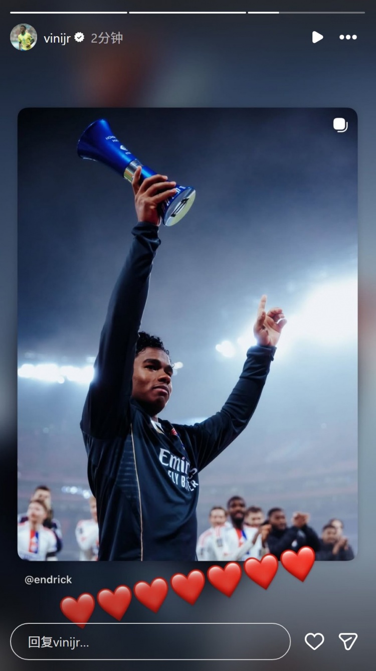 恩德里克当选本场比赛最佳球员,维尼修斯社媒转发恩德里克举起最佳奖杯的照片,配上红心表情符号,对他表示祝贺。
