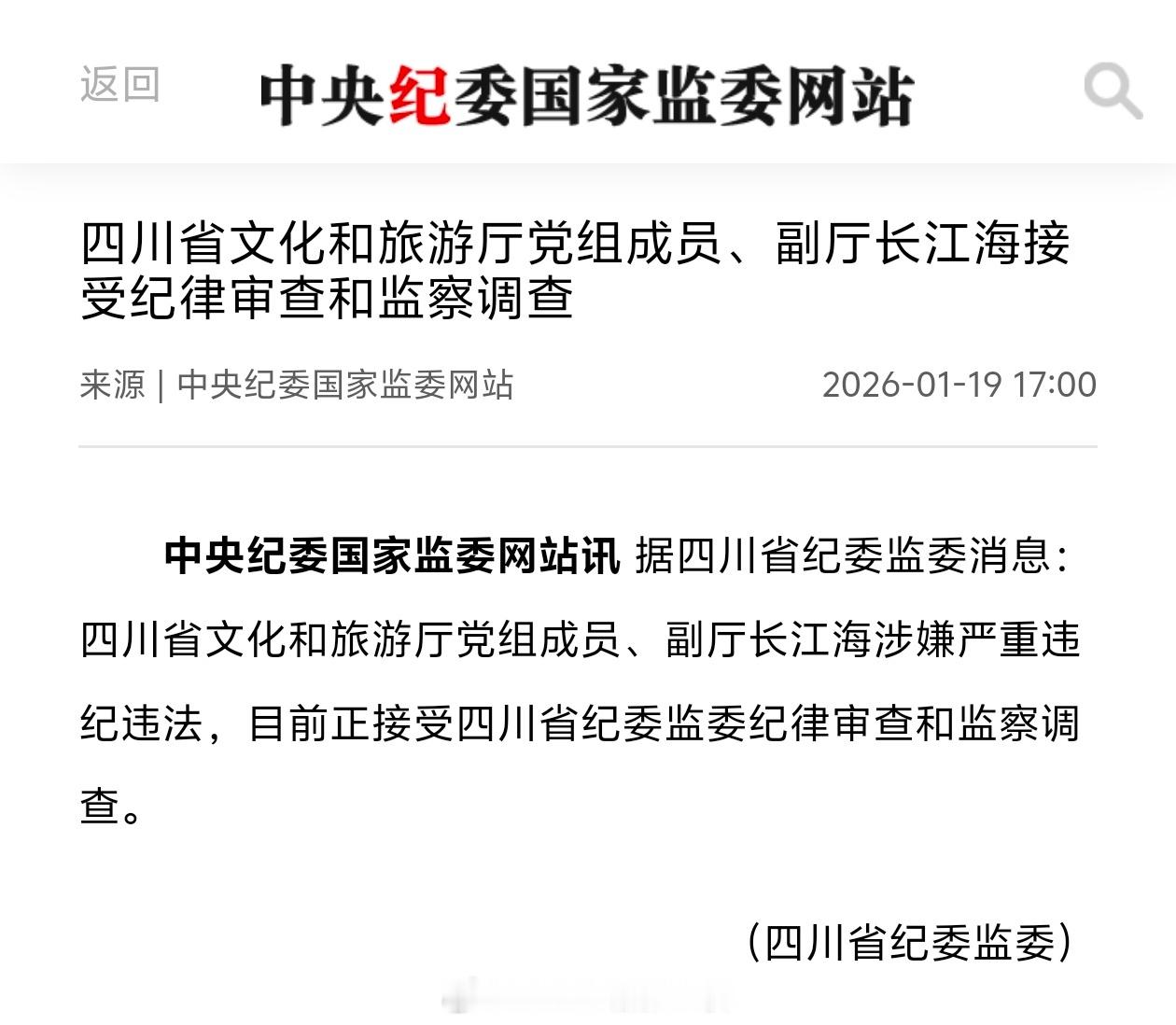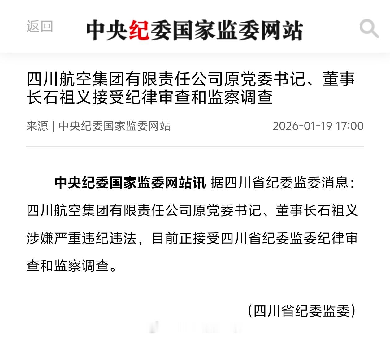 中纪委今天一口气发布两个四川有关单位领导被查的通报:·川航原党委书记、董事长石祖义涉嫌严重违纪违法,目前正接受四川省纪委监委纪律审查和监察调查。·四川省文化和旅游厅党组成员、副厅长江海涉嫌严重违纪违法,目前正接受四川省纪委监委纪律审查和监察调查。