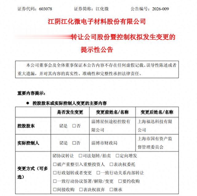 江化微表示,本次股份转让不会影响公司的正常经营。若本次交易顺利完成,将导致公司控股股东及实际控制人发生变化,公司控股股东将由淄博星恒途松变更为上海福迅科技,实际控制人将由淄博市财政局变更为上海市国资委。经公司向上海证券交易所申请,公司股票将于2026年1月20日(星期二)开市起复牌。