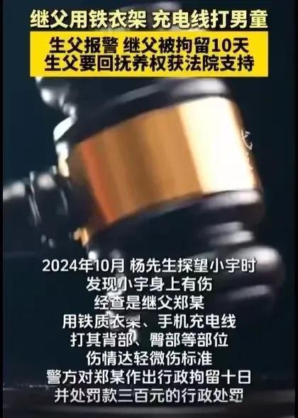 重庆这事儿看得人揪心!离婚爸爸探望7岁儿子,竟发现娃满身伤痕,一问才知是继父用铁衣架、数据线打的,爸爸当场心疼暴怒,立马报警追责,还铁了心要夺回儿子抚养权! 杨先生和前妻徐女士离婚时,5岁的儿子小宇判给了妈妈,从那以后,儿子就是他最大的牵挂。他总怕孩子太小,日子久了会忘了自己,一有空就抽时间去探望,就盼着多陪陪孩子、培养感情。 当初前妻坚决要带走儿子,杨先生想着妈妈照顾孩子会更细心,也就放心了,可他万万没料到,短短两年时间,前妻就再婚了,小宇多了个继父,这让他心里总有些隐隐的担忧,就盼着继父能好好对孩子。 2024年10月,杨先生又去看儿子,刚见面就觉得不对劲。以前活泼的小宇,这次脸上满是委屈,眼神黯淡无光,看着特别怯生生的。 杨先生心里一紧,赶紧把儿子搂进怀里柔声追问,小宇憋了半天,哭哭啼啼支支吾吾,最后慢慢撩起了衣服。 眼前的一幕让杨先生心如刀绞,儿子稚嫩的身上满是青紫伤痕,全是殴打留下的印记。在他耐心安抚下,小宇才敢说出真相,这些伤都是继父打的,对方动不动就拿铁衣架、数据线抽打他。 自己捧在手心里都舍不得碰一下的宝贝,竟被人这么狠心对待,杨先生又气又疼,当场就红了眼,一边抱着儿子安抚,一边立刻报警,他不仅要让这个狠心的继父付出代价,更要把儿子的抚养权夺回来,绝不能再让孩子受委屈。 警方介入后,很快查实了继父殴打小宇的事实,小宇身上的伤虽为轻微伤,但继父用凶器殴打未成年人情节恶劣,依据《治安管理处罚法》第43条,最终对其作出行政拘留10日、罚款300元的处罚。 紧接着,杨先生就着手准备变更抚养权的事,他说当初让儿子跟着妈妈,是盼着孩子能有好的生活,可现在孩子受了虐待,妈妈没尽到监护责任,他绝不能再让儿子留在那个环境里。 其实从法律上来说,杨先生要回抚养权的胜算很大,离婚后变更抚养权有明确的法定情形,其中就包括与子女共同生活的一方,不尽抚养义务或有虐待子女行为,对子女身心健康不利的,另一方就可以申请变更。 小宇被继父虐待,作为监护人的妈妈没能保护好孩子,已经对孩子的身心造成了不良影响,杨先生作为亲生父亲有抚养能力,又真心疼孩子护孩子,法院大概率会支持他的诉求。 这事儿里,最无辜的就是7岁的小宇,本该无忧无虑长大,却要承受身体和心理的双重伤害,而继父的狠心、妈妈的失职,都该被谴责。 不管是亲生父母还是继父母,都该明白,孩子不是累赘,管教也绝不能靠暴力,不爱可以,但绝对不能伤害,而作为监护人,更要守住底线,全力保护好孩子的安全。 你觉得杨先生能顺利要回抚养权吗?遇到孩子被虐待的情况,你觉得该怎么及时止损? 来源:裁判文书网、重庆法院相关公开信息