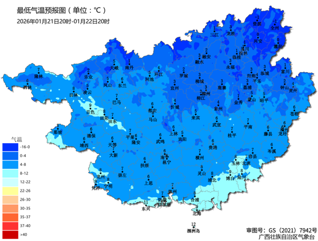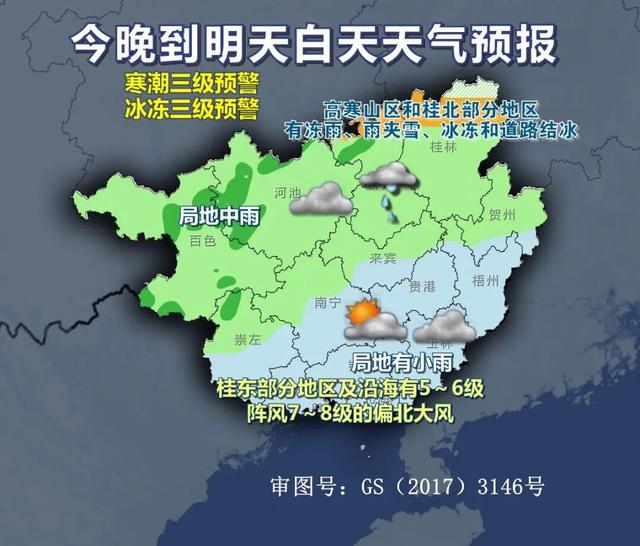 20日晚上到22日白天,桂北、桂西阴天有小雨、局地中雨,其它地区多云到阴天有分散小雨。高寒山区和桂北部分地区有冻雨、雨夹雪、雪、冰冻和道路结冰。桂东部分地区和沿海有5~6级、阵风7~8级的偏北大风。最低气温:高寒山区-7~-1℃,桂北-1~4℃,桂中4~7℃,桂南7~11℃。