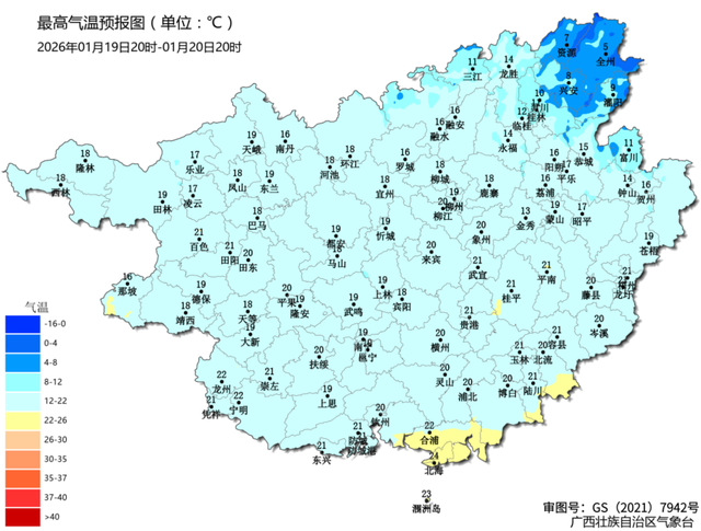 0120日至22日最高气温预报图