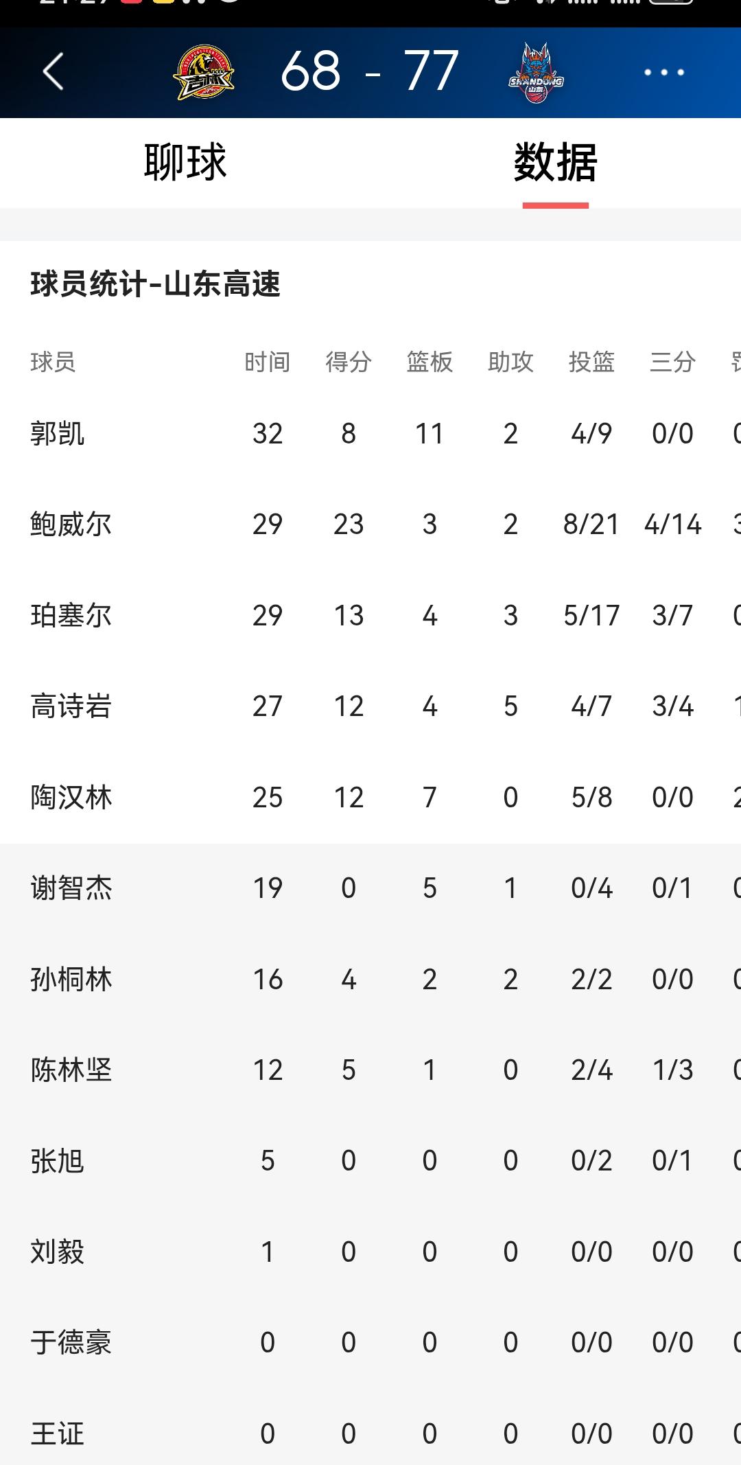 山东高速男篮以残阵77比68战胜吉林长白山!第4外援25日也将到队。1月19日,本场比赛高诗岩三分球4中3拿到12分,陶汉林12分,郭凯8分,鲍威尔23分,珀塞尔13分。 山东队今晚队中有三名球员感冒,陈培东已返回济南休息,于德豪有小伤,大外援克里斯赛前感冒发烧缺席,郭凯退烧已复出,山东男篮能在长春客场击败吉林东北虎取得一场胜利,极为不易。 山东男篮已正式与萨夏·基莱亚 - 琼斯完成签约。待向CBA公司报送注册材料,琼斯将代表山东高速男篮出战CBA联赛。 据说这个外援挺牛逼尤其是在二次篮板,中距离投射,盖帽,非常牛逼,他的小勾手特准,关键年龄黄金年龄段。看介绍不错,不知道是不是能适应CBA的赛场和裁判!球员不是决定因素,要适应裁判。 本场比赛在主力外援克里斯感冒发烧缺席的情况下,高诗岩发挥出色,三分球4投三中,发挥可以,鲍威尔今晚表现也可以,既能保护球员又能保持球队运转,期待继续展现团队协作的力量!谢智杰的近几场表现也值得关注,如果能持续稳定发挥,对球队来说是个好消息。