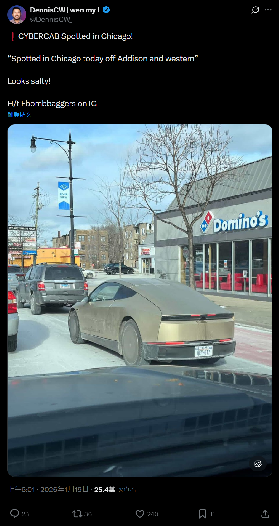 IT之家1月19日消息,汽车博主SawyerMerritt今天在X平台发文,分享自己在美国芝加哥拍到的特斯拉Cybercab无人驾驶出租车。