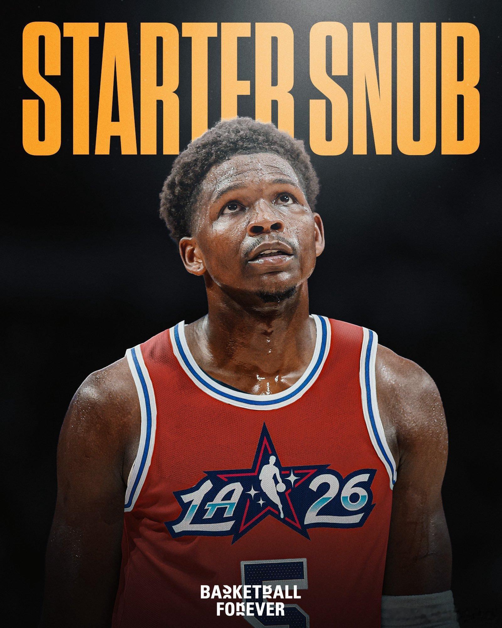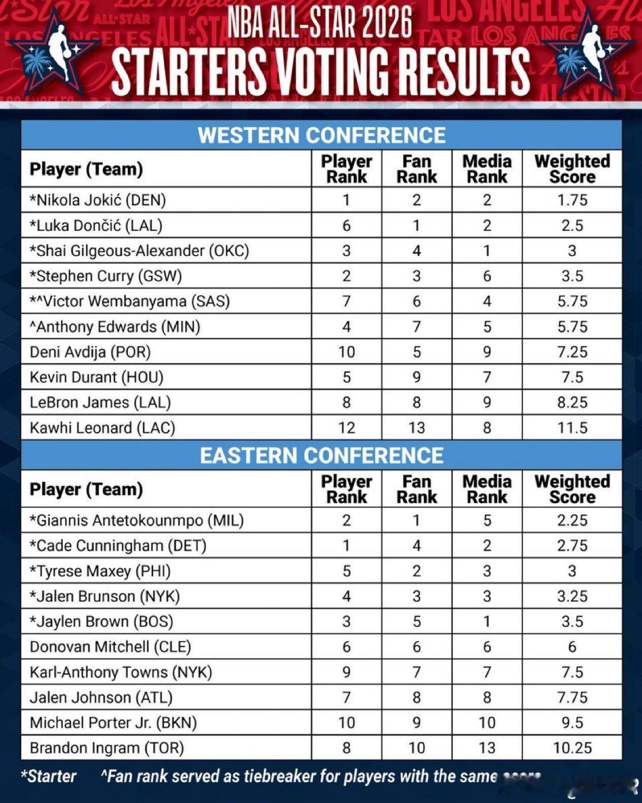 落选首发!爱德华兹与文班亚马的最终投票得分均为5.75,但根据规则,球迷投票排名将作为tiebreaker,因此文班亚马当选首发。球迷投票排名:文班亚马西部第6,爱德华兹第7,两人相差4505张票