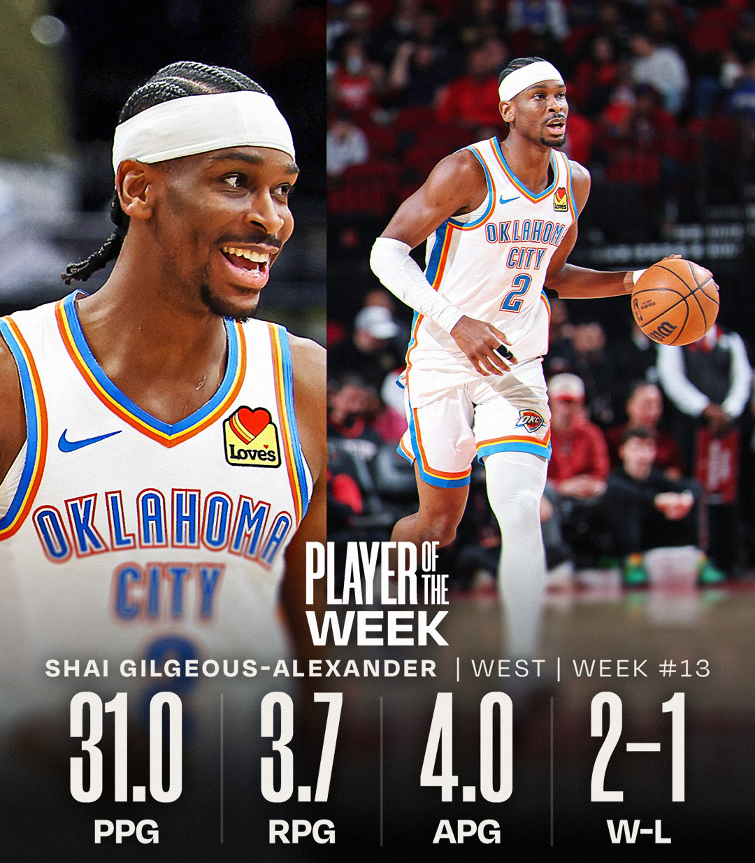 NBA上周东西部最佳球员出炉,东部阿德巴约、西部亚历山大。NBA