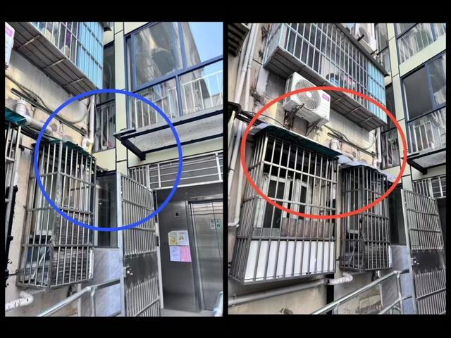 施工单位为相邻居民家窗户加装雨棚避免电梯雨棚溅水(改造后见右图)。
