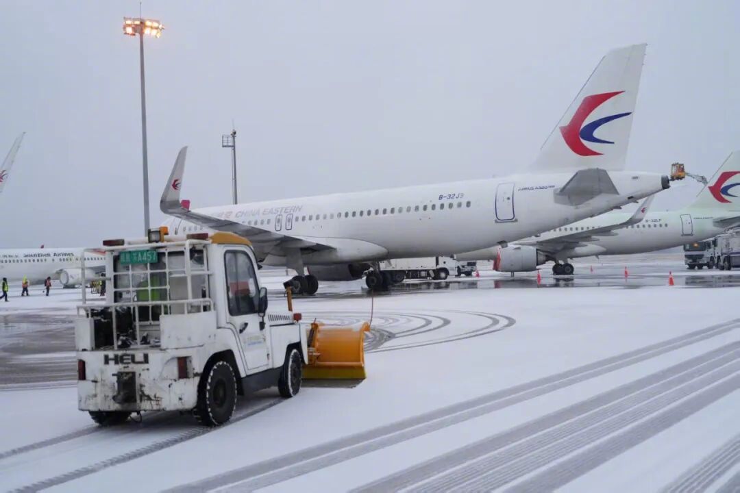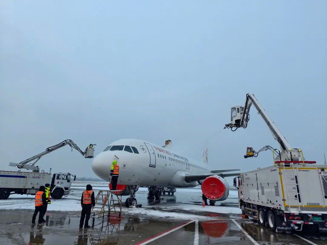 为确保航班的安全运行,东航江苏公司组织除冰车为每一架起飞的航班开展除冰雪作业,在航空器下方采用人工除雪的方式除雪,与航空器有安全距离的区域采用除雪车除雪。目前第一个航班MU2721已经安全起飞。
