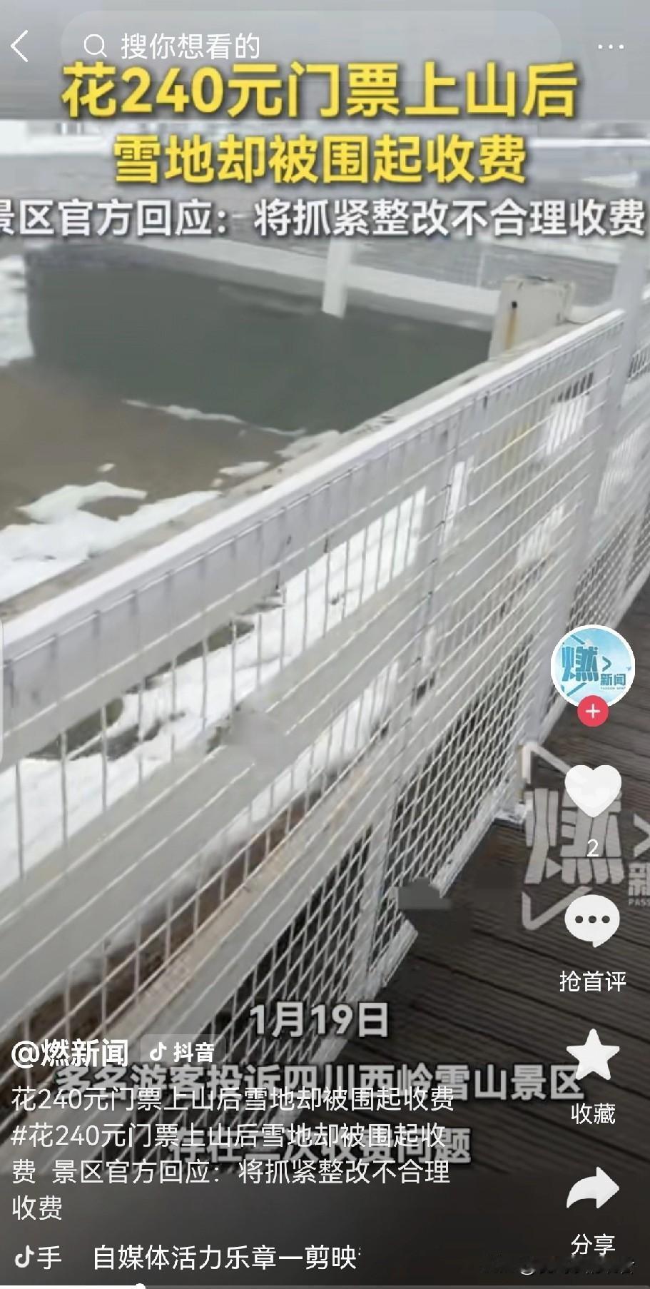 没想到呀没想到,成都一游客花了240元钱去西岭雪山看雪,上了山顶,才发现山顶有雪的地方竟然被围栏拦起来了,要看雪还要单独买80元的门票才能进去,结果看了个寂寞。 我去过西岭雪山好几次,都是好多年前去的,有一次还从后山爬到过山顶,西岭雪山对我的印象是美好的,那时没这么多弯弯绕绕的。 成都的天气稍微好的时候,都能够印证那句名诗“窗含西岭千秋雪”的美景,花240元到山顶看不了雪你说那还去去西岭雪山有什么意义? 西岭雪山这波吃相太难看了,在如今很多景区免费开,千方百计招待远来的游客,可是,西岭雪山却在使劲的往外推游客,这是一种什么操作方式?