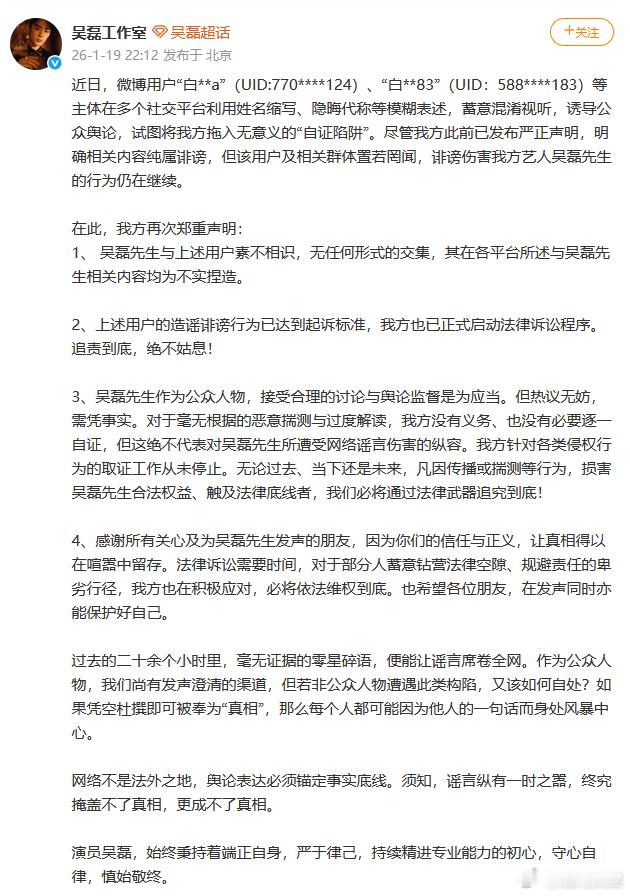 白珊珊向吴磊道歉 1月19日,再次就白珊珊喊话吴磊事件进行回应,声明强调吴磊先生与白珊珊不相识,无任何形式的交集,其在各平台所述与吴磊相关内容均为不实捏造,将对白珊珊进行法律诉讼,追责到底。工作室称“我方没有义务、也没有必要逐一自证,但这绝不代表对吴磊先生所遭受网络谣言伤害的纵容。我方针对各类侵权行为的取证工作从未停止。无论过去、当下还是未来,凡因传播或揣测等行为,损害吴磊先生合法权益、触及法律底线者,我们必将通过法律武器追究到底!”稍晚,疑似白珊珊小号“-833-”发文致歉,称“起初在网络上本来只是和一个同名同姓的朋友调侃几句,因为自己的账号被封禁了,我就艾特您想要引流。”此前,微博官方发文辟谣白珊珊被盗号称经平台详细核实,用户白珊珊所提到的所谓“盗号”行为并未发生,并对白珊珊的两个账号处以关闭账号的处置,平台也已将相关线索上报公安机关。