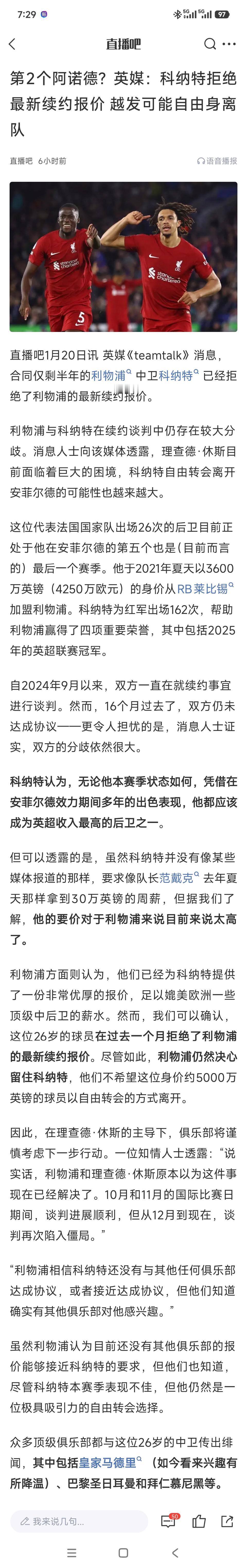 利物浦这家俱乐部很有问题,科纳特至今没续约,怪不得格伊不来呢。 科纳特本想免签去皇马,结果表现很差,皇马公开说不签他.... 利物浦想续约,直到今年都没完成,所以赛季结束后走人。 还是格伊幸运,曼城就不会这样子,能拿冠军,钱又多,比在利物浦舒服。 科纳特不续约就卖掉呀,拜拜让他走?利物浦真是年年出现一位阿诺德。[笑哭]