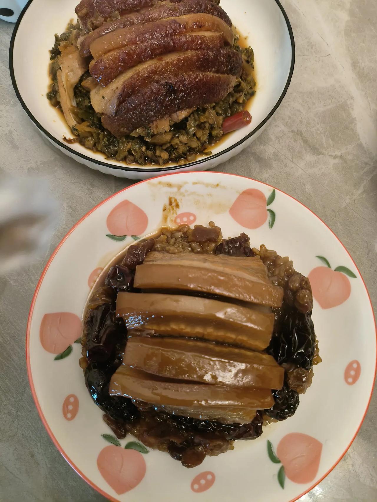 尝试夹沙肉 在四川蒸菜里,有一道名为夹沙肉的甜味肉菜!我向来没吃过,心想五花肉做成甜口的,能好吃吗? 夹沙肉可是老公的心头好! 今日天气不好,老公给我蒸了扣肉,还蒸了龙眼肉和夹沙肉。 午饭时,他非让我吃一块,说这次特意把肉切小了。 我鼓起勇气尝了一块,诶!别说,还真挺好吃!吃不出肉味,入口即化,豆沙馅也是老公加工过的,香甜且有颗粒感。没想到,我竟多次错过品尝这道菜的机会! 今天的扣肉,肉特意切成大块,很有嚼劲!吃得那叫一个过瘾!