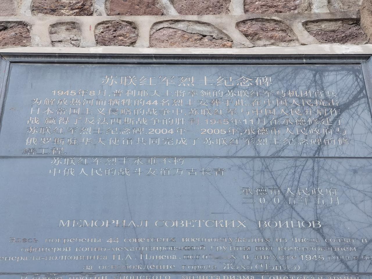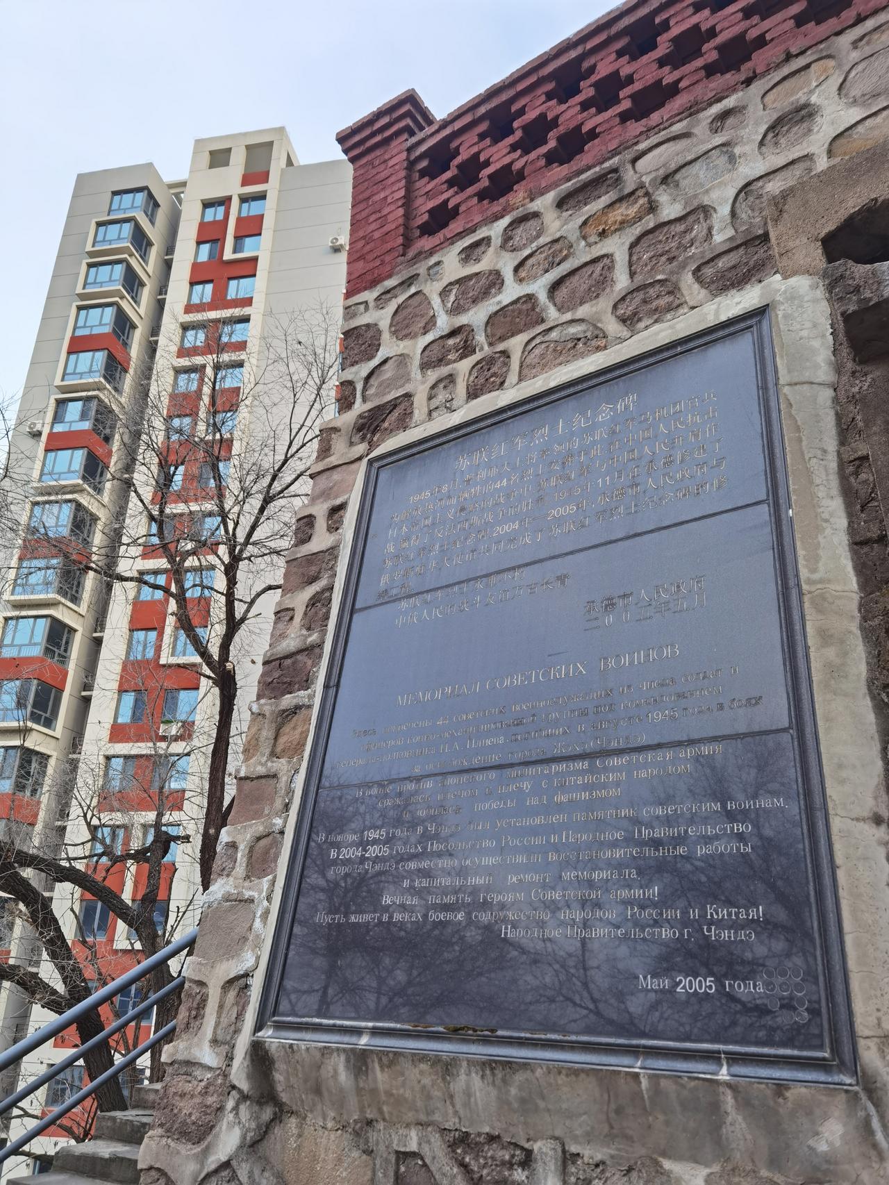 承德市区有一座被居民楼环绕的苏军烈士纪念塔。 这是为纪念1945年8月为解放热河(现在承德)而牺牲的44名苏联红军而建。最初于1945年9月在避暑山庄德汇门前修建,11月7日举行落成典礼。1978年对纪念碑所有石砖进行编号,保持原来的规模和形制,迁建在牛圈子沟石油家属院南山上,也就是现在的位置。 到苏军纪念碑要穿过石油上院小区,朝山坡方向前行,并要拾级而上。目前纪念碑院内不能参观,可通过上山小径俯瞰院内布局。院外墙体花岗岩刻有纪念碑简介。