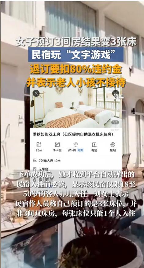 “太坑人了!”近日,江西,一女子为了带老人小孩出游,特意在网上预订了3个“一晚230元”的民宿,结果刚付完款就收到店家的“入住事项”,发现“3间房”竟变成了“3张床位”!更气人的是,退订要扣80%违约金,民宿还宣称“不接待老人小孩”!网友:这么黑? 出门旅游订民宿本是再正常不过的事,大家都想着选个舒适的住处,可谁能想到,一次看似普通的预订,竟会掉进商家的文字游戏里。 据媒体1月18日报道,刘女士计划带一家老小出门游玩,然后便在软件上找民宿,看见标价“一晚230元”的民宿还不错,就下单,没想到刚付完款就收到平台弹出的“入住必读”,上面写着该民宿仅限18至50岁客人入住,还注明她预订的是“3张床位”,而非3间双床房,每张床位仅能住1人。 刘女士瞬间懵了,自己明明订的是“3间房”,怎么就成了“3张床位”?她联系民宿工作人员,对方却理直气壮地说“房型标注里写了是床位”,还表示老人小孩不在接待范围内。刘女士想退订,却被要求扣除80%的违约金,相当于白扔了大几百块。 网友看后表示,这就是明摆着的文字游戏!‘3间房’和‘3张床位’能一样吗?也有网友表示,一张床就230元商家也太黑心了!还有退订扣80%违约金,这是抢钱吧,必须维权到底! 信息来源:《女子预订3间房结果变3张床,民宿玩“文字游戏”,退订要扣80%违约金,并表示老人小孩不接待。》荆楚网
