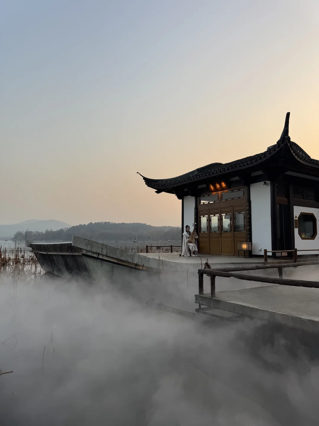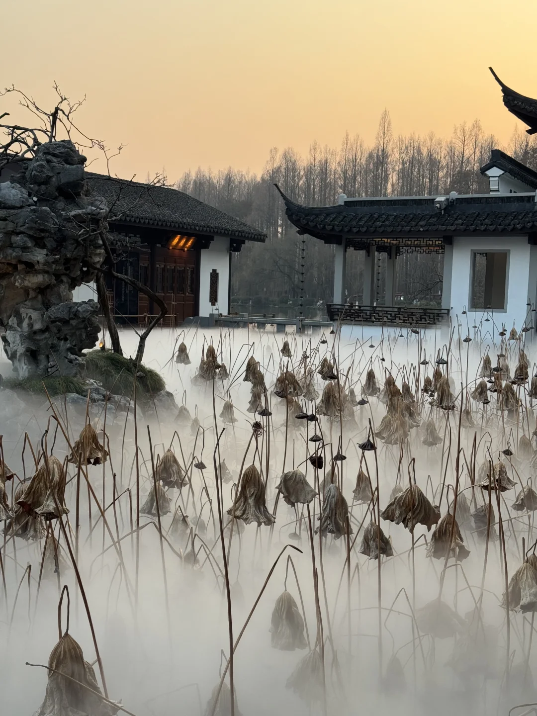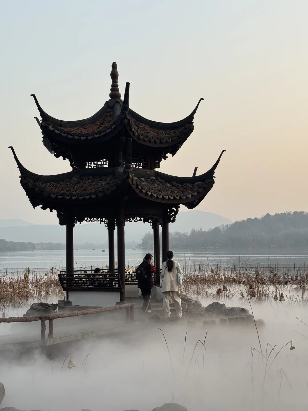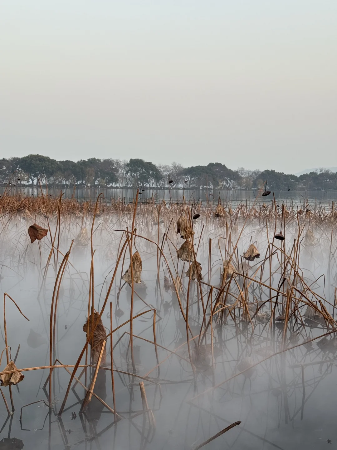 不知道是谁想出来的设计! 在西湖边闲逛远远看到一阵雾气,循着雾气找寻过去,映入眼帘的画面太美了🌫️ 残荷配上仙气腾腾的轻烟,简直太仙了 📍北山街方向的苏堤入口,第二个桥右拐