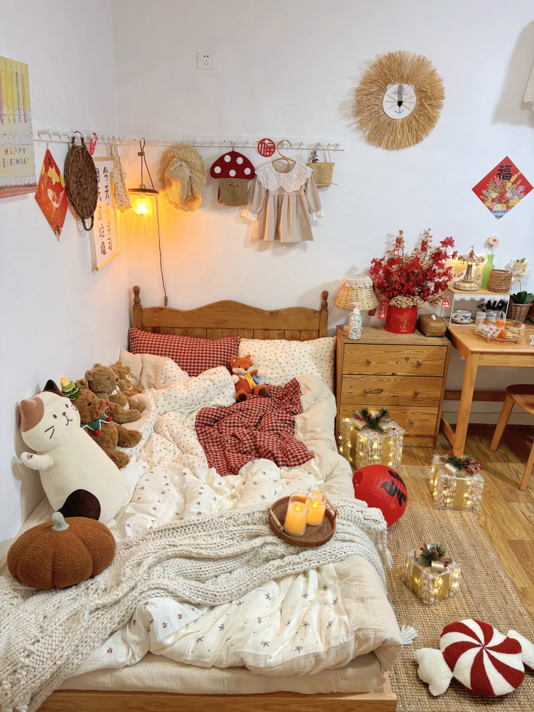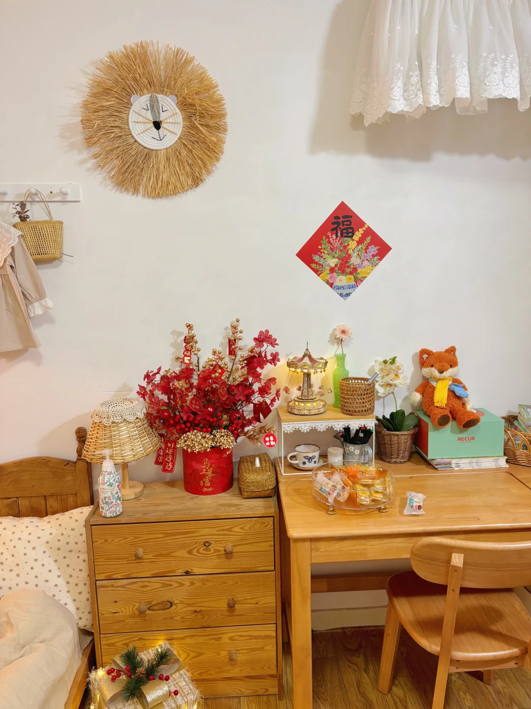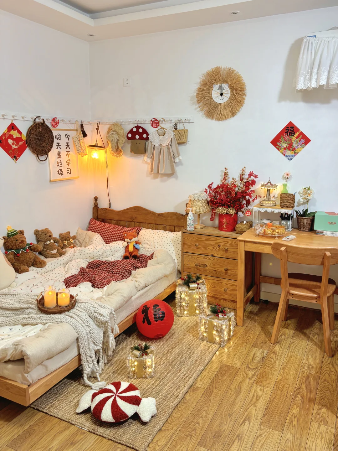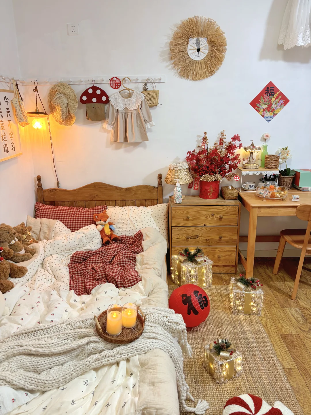 15平的复古小房间终于换上新年皮肤🧧 红色床品一铺上 整个房间都暖fufu的~ 软乎乎的被窝里藏着最爱的狐狸崽崽🦊 蓬松大尾巴抱着睡觉太舒服啦✨ 桌上是装满零食的糖果盒🍬 随时都可以吃到喜欢的小零食🍪 每次推开房门都是香香甜甜的味道 玩累了拿沐浴露洗个澡🧼 葡萄西柚味道的 洗完身上也是香香的👧 这就是冬日里治愈的小角落呀🍯 已经开始期待除夕夜窝在这里守岁啦🎇