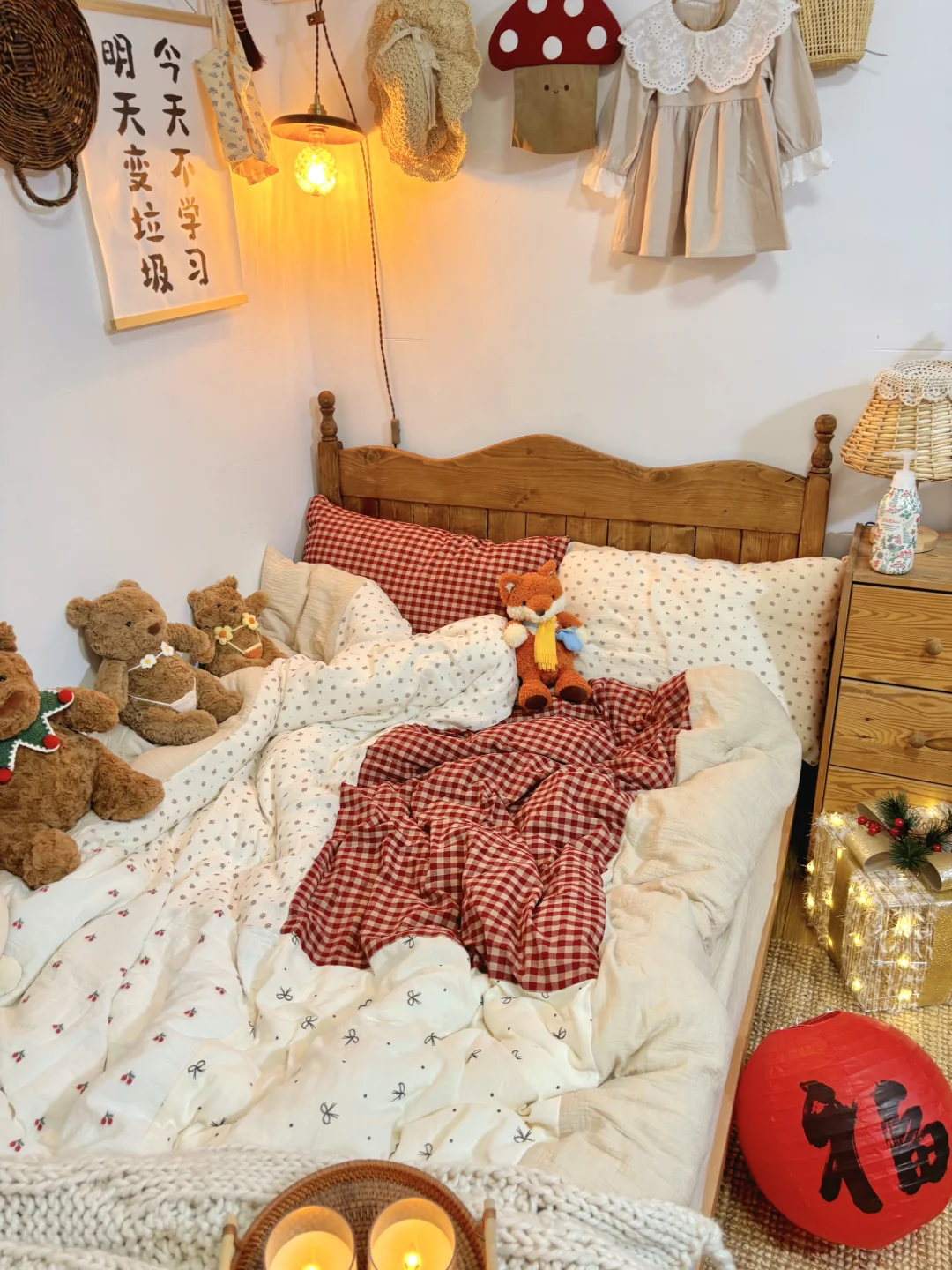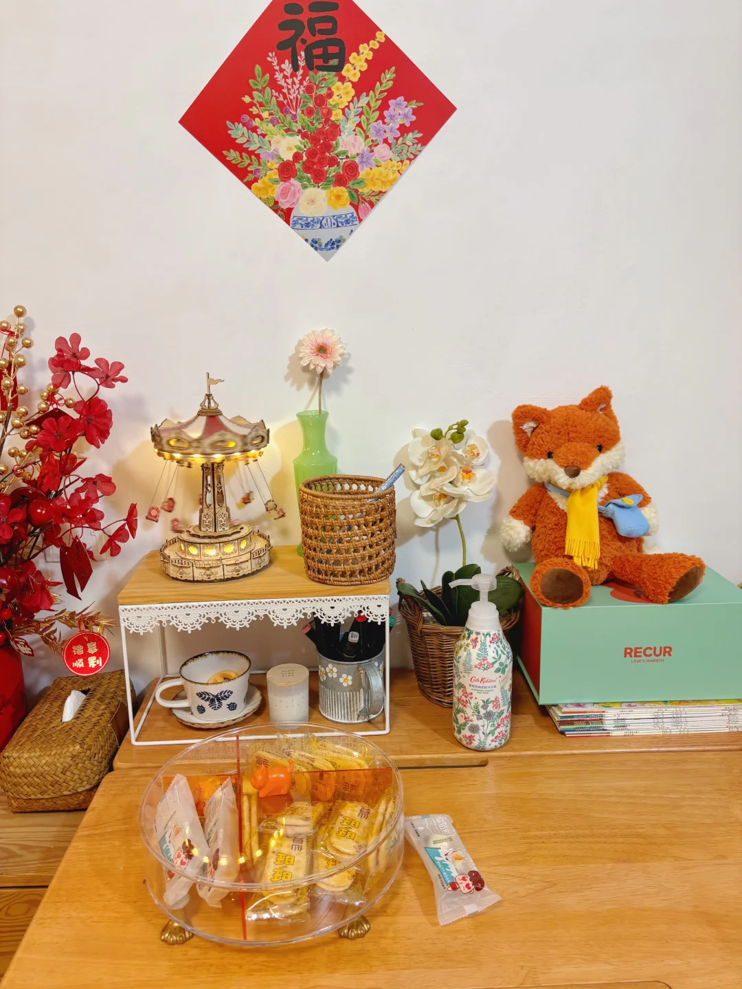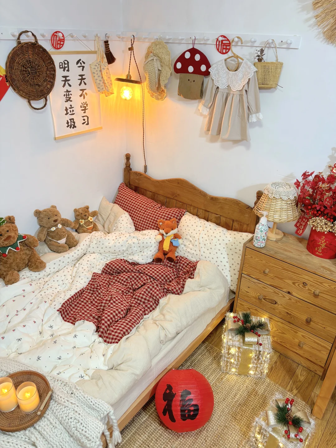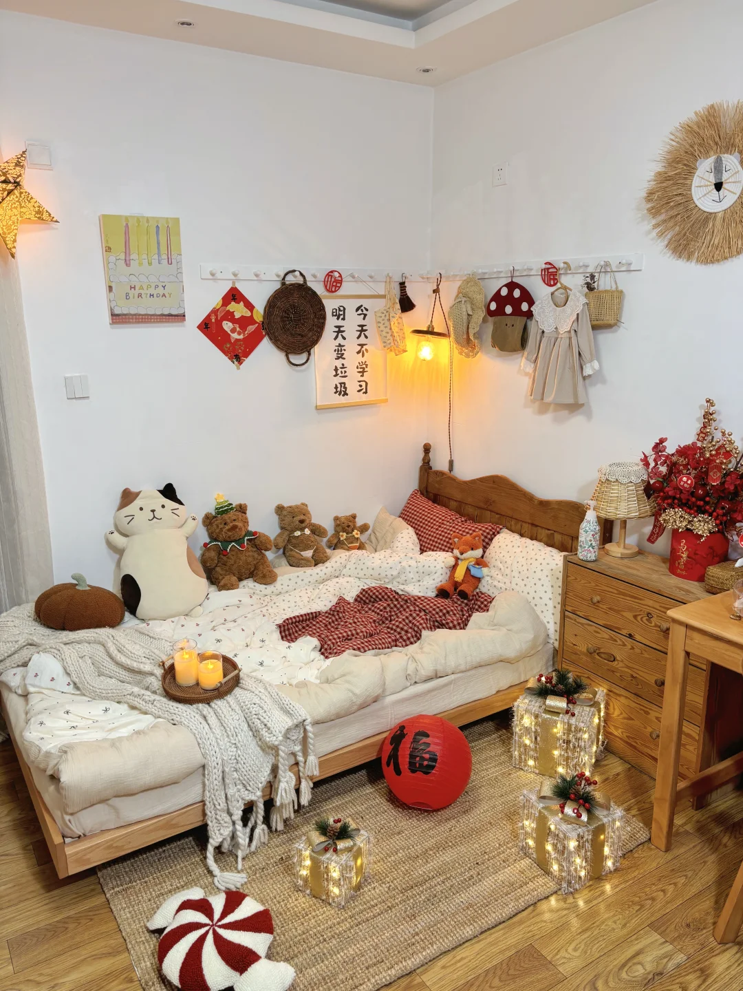 15平的复古小房间终于换上新年皮肤🧧 红色床品一铺上 整个房间都暖fufu的~ 软乎乎的被窝里藏着最爱的狐狸崽崽🦊 蓬松大尾巴抱着睡觉太舒服啦✨ 桌上是装满零食的糖果盒🍬 随时都可以吃到喜欢的小零食🍪 每次推开房门都是香香甜甜的味道 玩累了拿沐浴露洗个澡🧼 葡萄西柚味道的 洗完身上也是香香的👧 这就是冬日里治愈的小角落呀🍯 已经开始期待除夕夜窝在这里守岁啦🎇