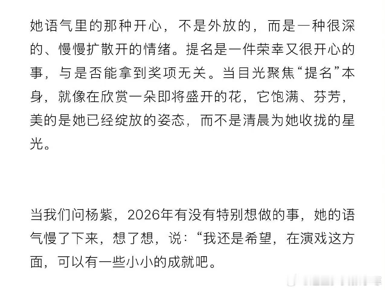 杨紫说自己是个挺容易满足的人杨紫希望在演戏方面有一些成就,愿我紫紫想要,都能得到,一定的杨紫希望在演戏方面有一些成就
