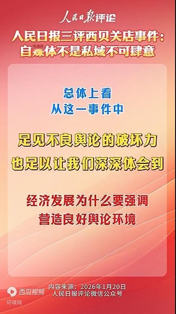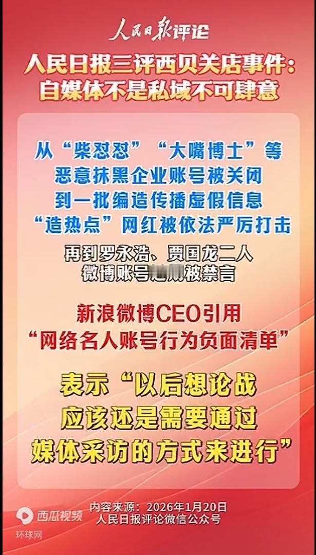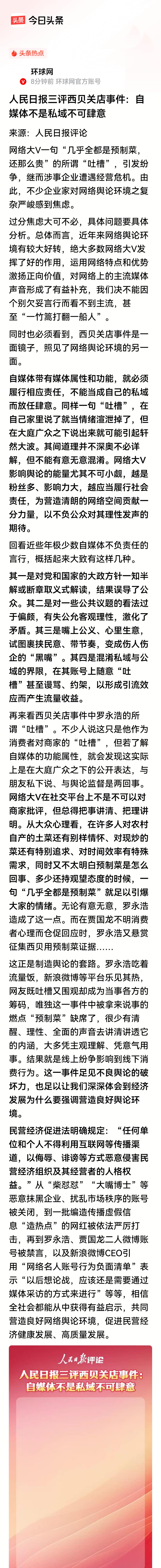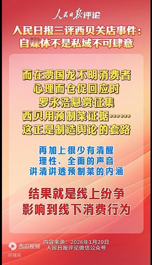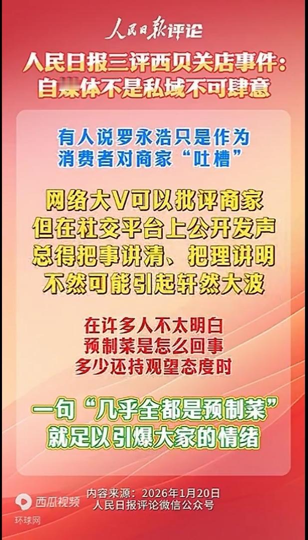 人民日报三评西贝事件,这一次点名罗永浩以及平台! 罗永浩吃着流量饭,新浪微博等平台乐见其热,网友既吐槽又围观却成为当事各方的筹码。 作为网民,其实是被他们裹挟了。受伤的岂止是西贝,网民也成了他们网络上的牺牲品。由此看来,罗永浩直接责任,平台管理责任,都应该受到严厉管制!