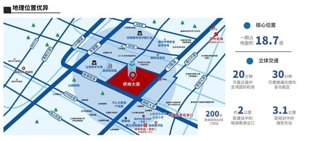 侨商大厦项目选址东新科技城总部经济园核心区块,一期占地面积18.7亩,位于瑞安瑞枫大道以北、凤锦路以东、港口大道以西,区位优势显著,交通网络四通八达,30分钟内可便捷通达城市各功能区块;距规划中的瑞湖高速出口仅2公里,便于联动周边城市资源;紧邻轻轨S2线汀田站(直线距离200米),20分钟即可直达温州龙湾国际机场,为商务出行与亲友往来提供保障。
