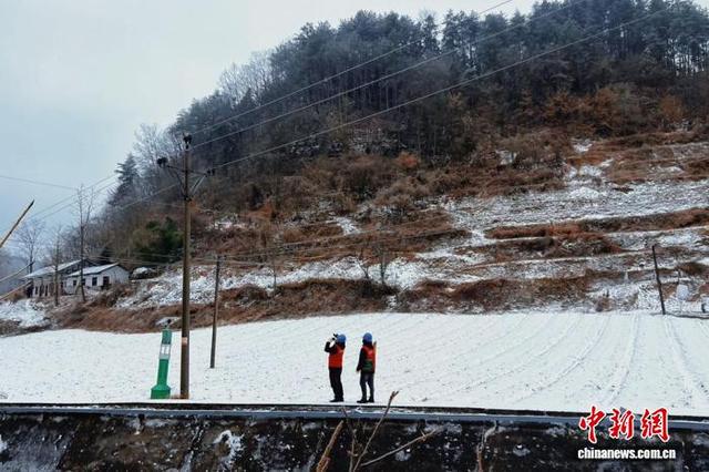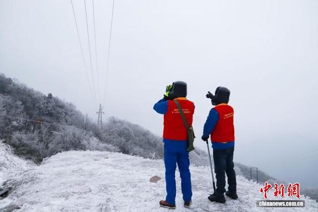 巴中市南江县电力服务队员正对35千伏寨桃线开展覆冰观测。刘桃摄